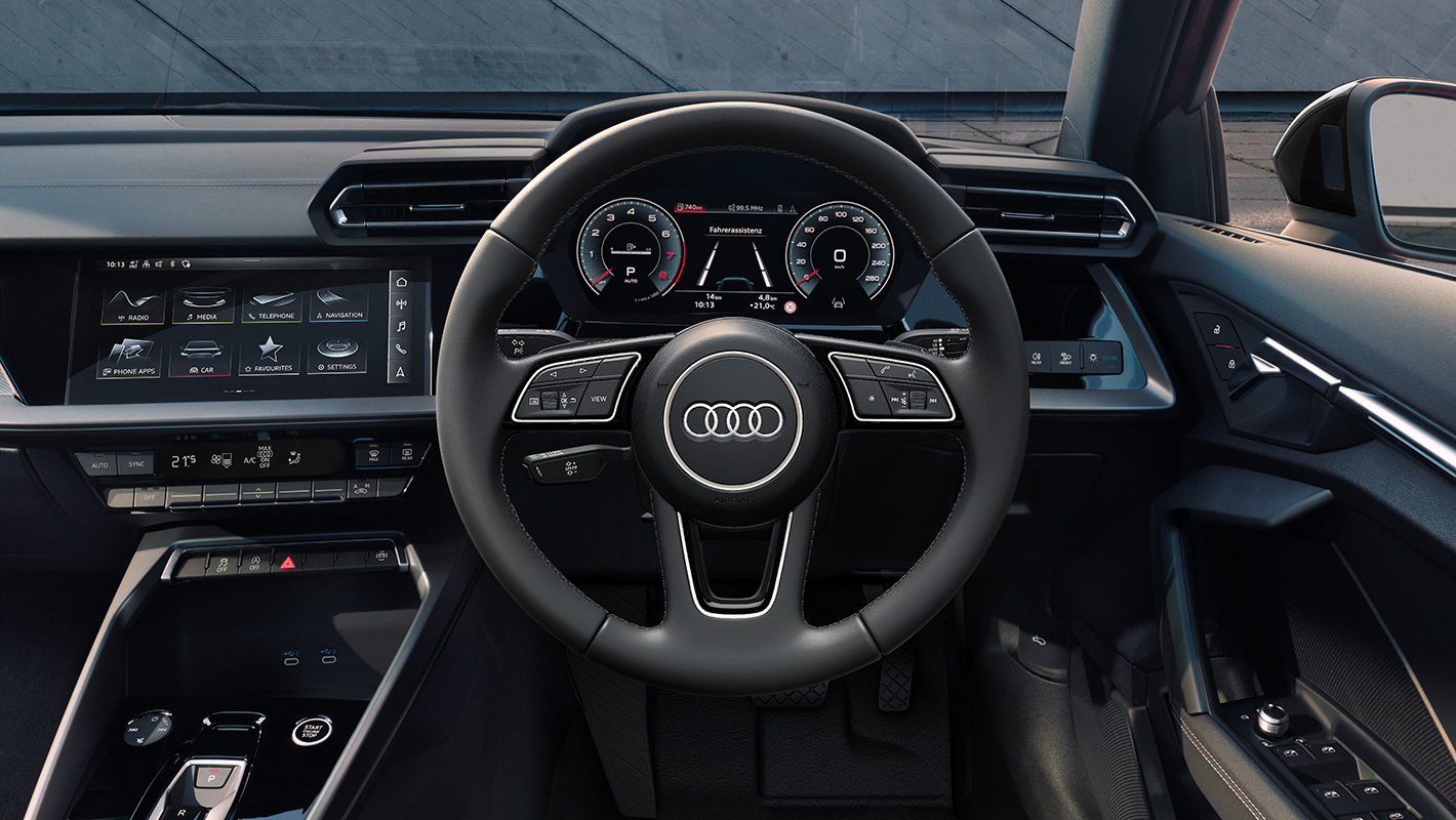 Audi A3のシャープなデザインのインテリアには、ドライバー視点に立って開発された技術が惜しみなく注ぎ込まれています。バーチャルコックピットは、メーター、地図などをフレキシブルに表示。ダッシュボードと一体化したタッチスクリーン式MMIナビゲーション*は、多彩なインフォテインメントや車両機能の制御をスマートフォン画面のように直感的にコントロールできます。