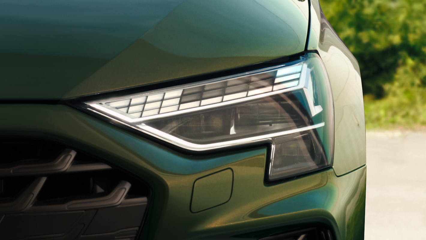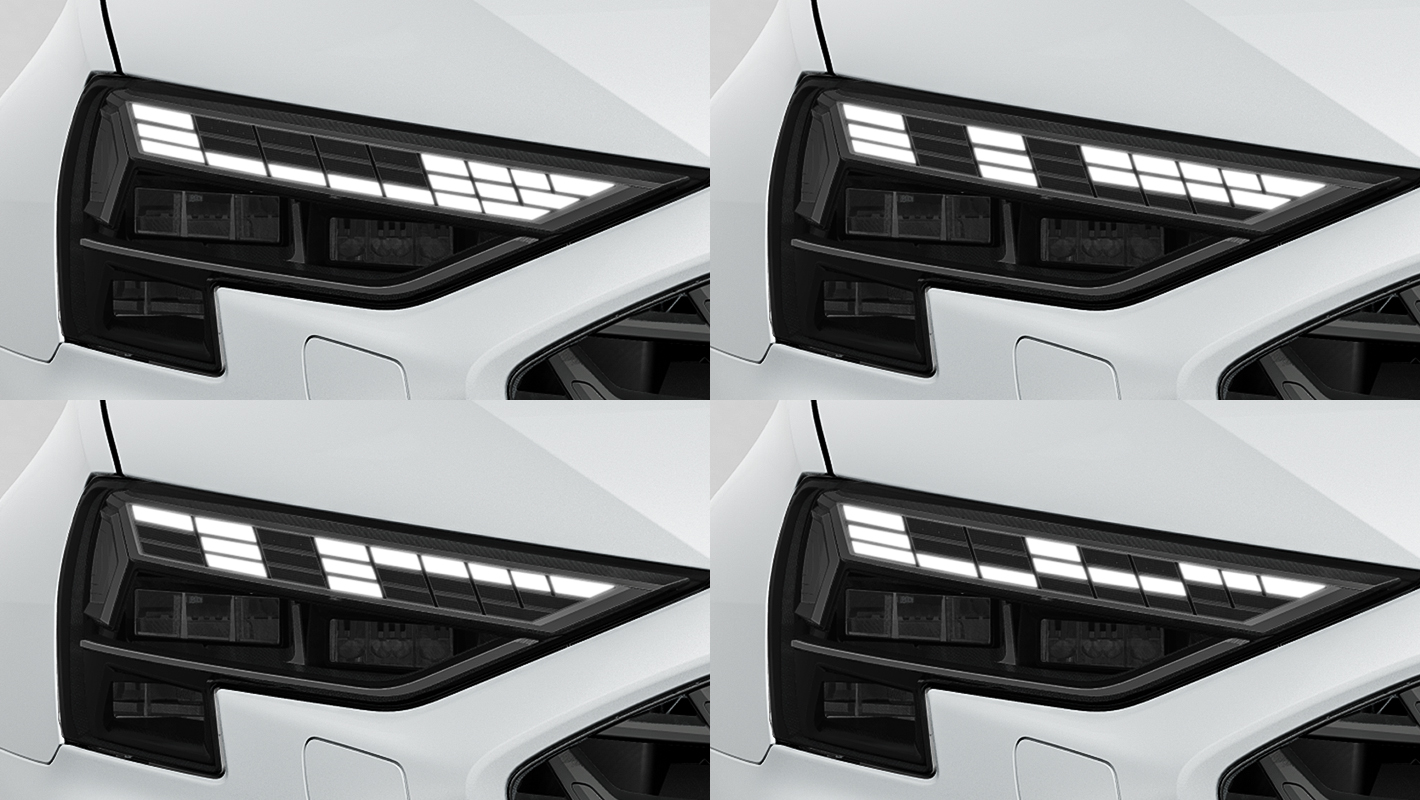 LED光源と精密な光学デバイスを組み合わせたカメラシステムによって、状況に合わせて配光を可変させ高度に制御。高速走行でハイビーム使用時にカメラが対向車や先行車を検知すると、そのエリアへのハイビームをオフにしつつ、それ以外の車間エリアや周辺は明るく照らし続けます。MMIタッチディスプレイで4つの点灯パターンを切り替えられるデジタルデイタイムランニングライトと、印象的な光の流れを生みだすダイナミックターンインディケーターも搭載しています。