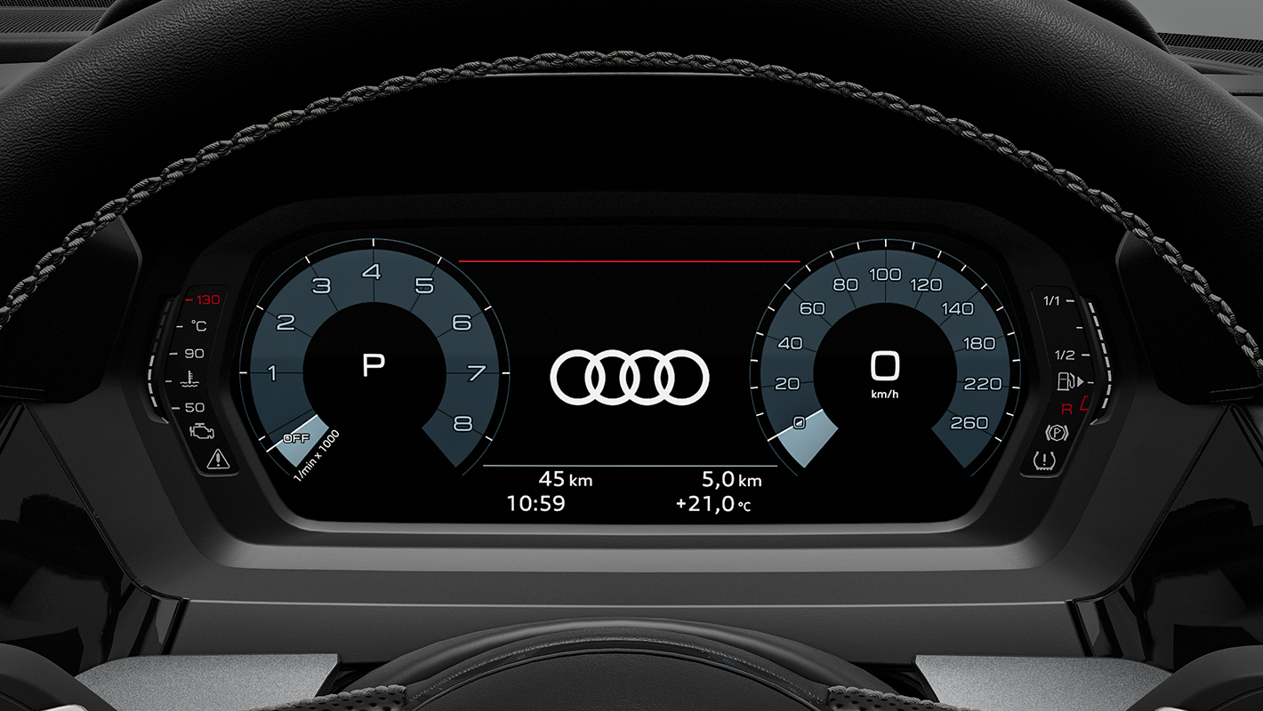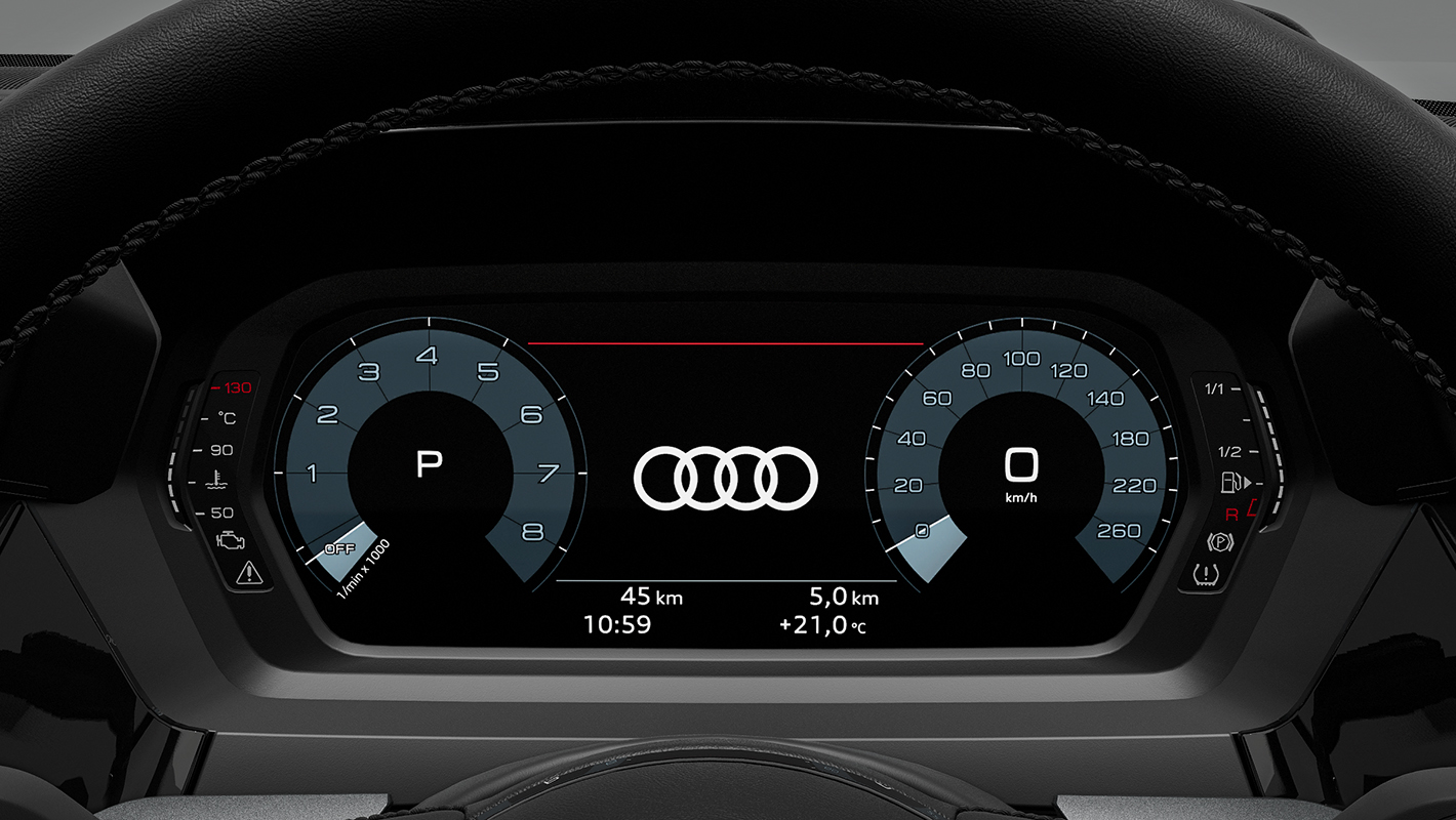 高解像度10.25インチカラー液晶フルデジタルディスプレイに、スピードメーター、タコメーター、マップ、ラジオ/メディア情報などをフレキシブルに表示。操作はマルチファンクション付きステアリングホイールからダイレクトに行えます。またVIEWボタンを押すことでメーターの大小切り替えも可能。メーター表示を小さくすれば、オンボードコンピューターやMMIナビゲーションのコンテンツ、3D地形図などをより見やすく画面の広いエリアに表示できます。