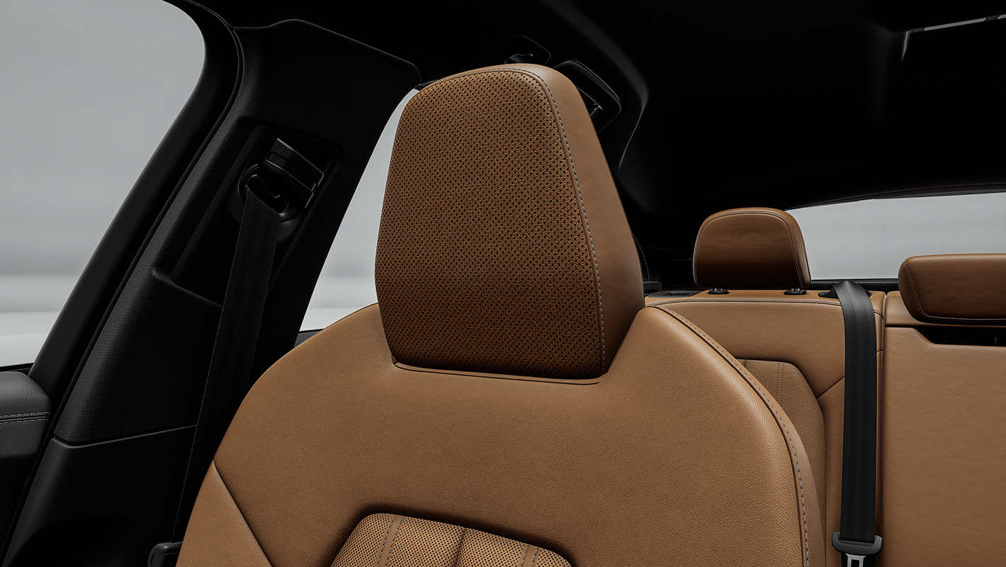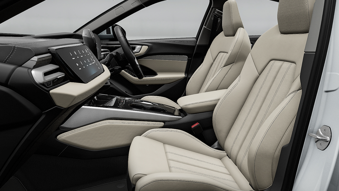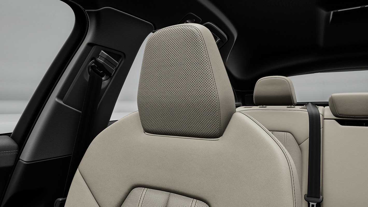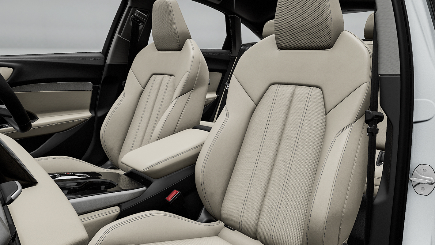 一体型ヘッドレストを備えたホールド性の高いスポーツシート。シートサイドボルスターはコーナリングの際、身体をしっかりサポートする形状に。パーフォレイテッド加工が施され、シートベンチレーション機能を搭載。高品質なレザーと耐久性に優れるアーティフィシャルレザーを組み合わせた素材で、シートカラーはマザーオブパールベージュになります。