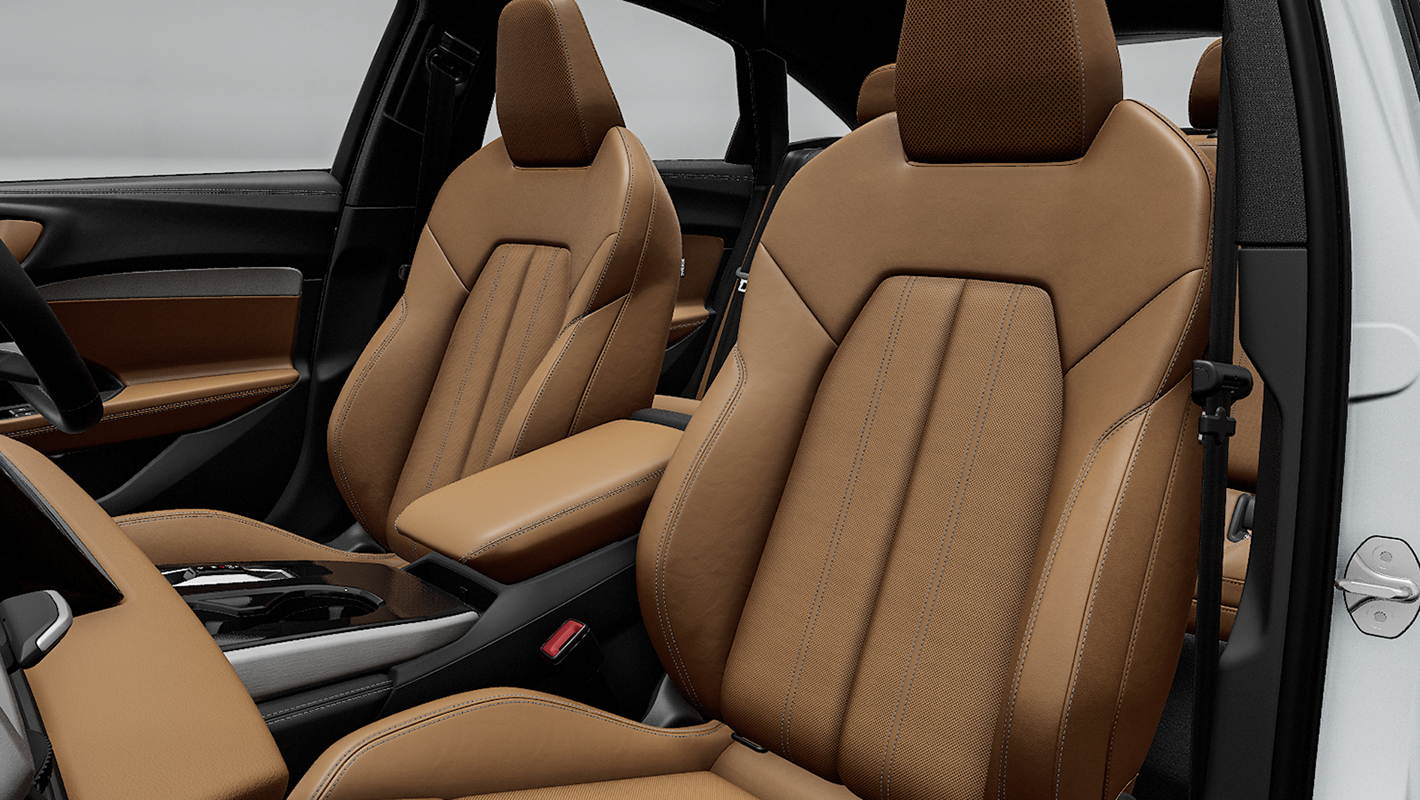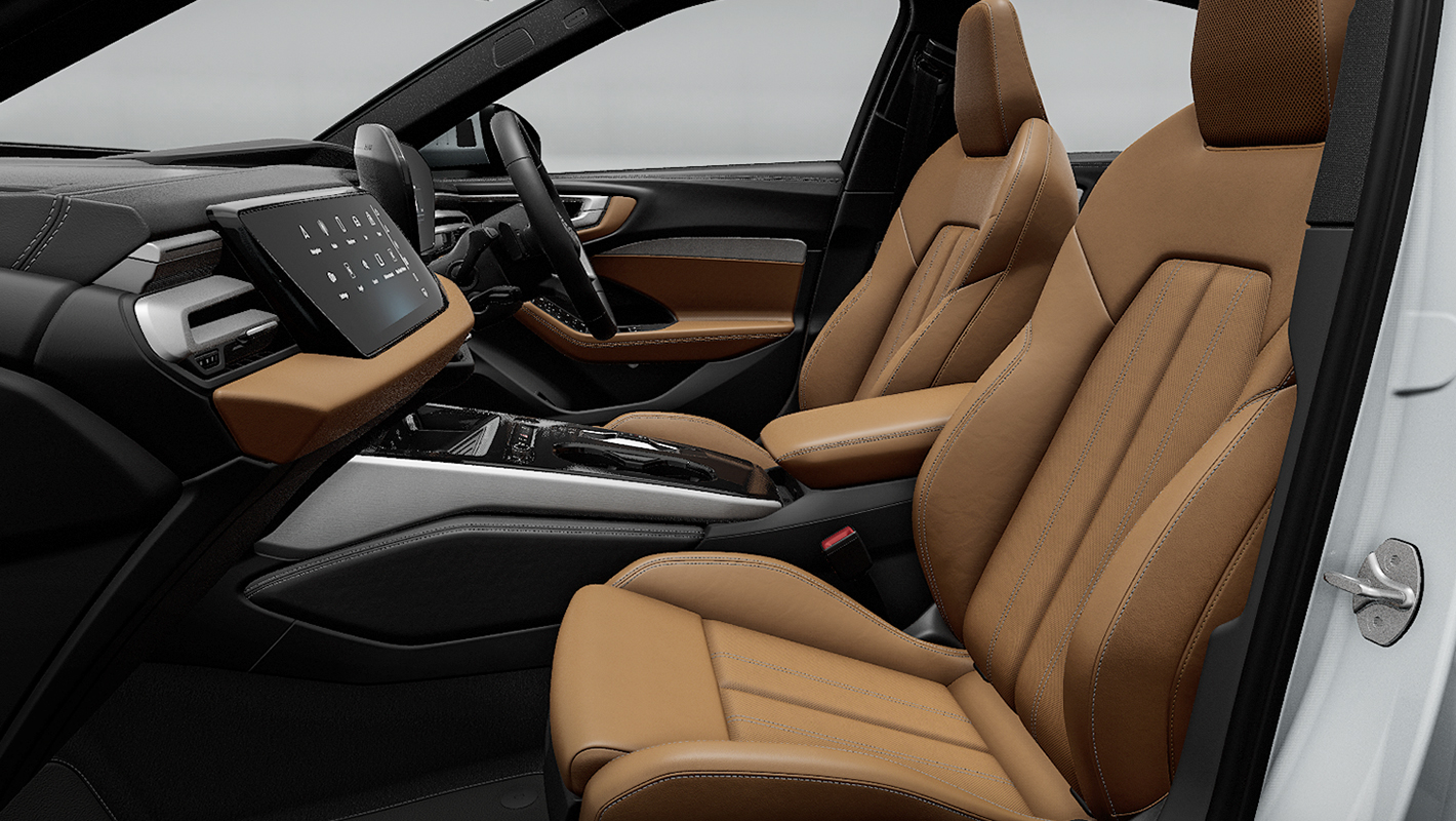 一体型ヘッドレストを備えたホールド性の高いスポーツシート。シートサイドボルスターはコーナリングの際、身体をしっかりサポートする形状に。パーフォレイテッド加工が施され、シートベンチレーション機能を搭載。高品質なレザーと耐久性に優れるアーティフィシャルレザーを組み合わせた素材で、シートカラーはマスカットブラウンになります。