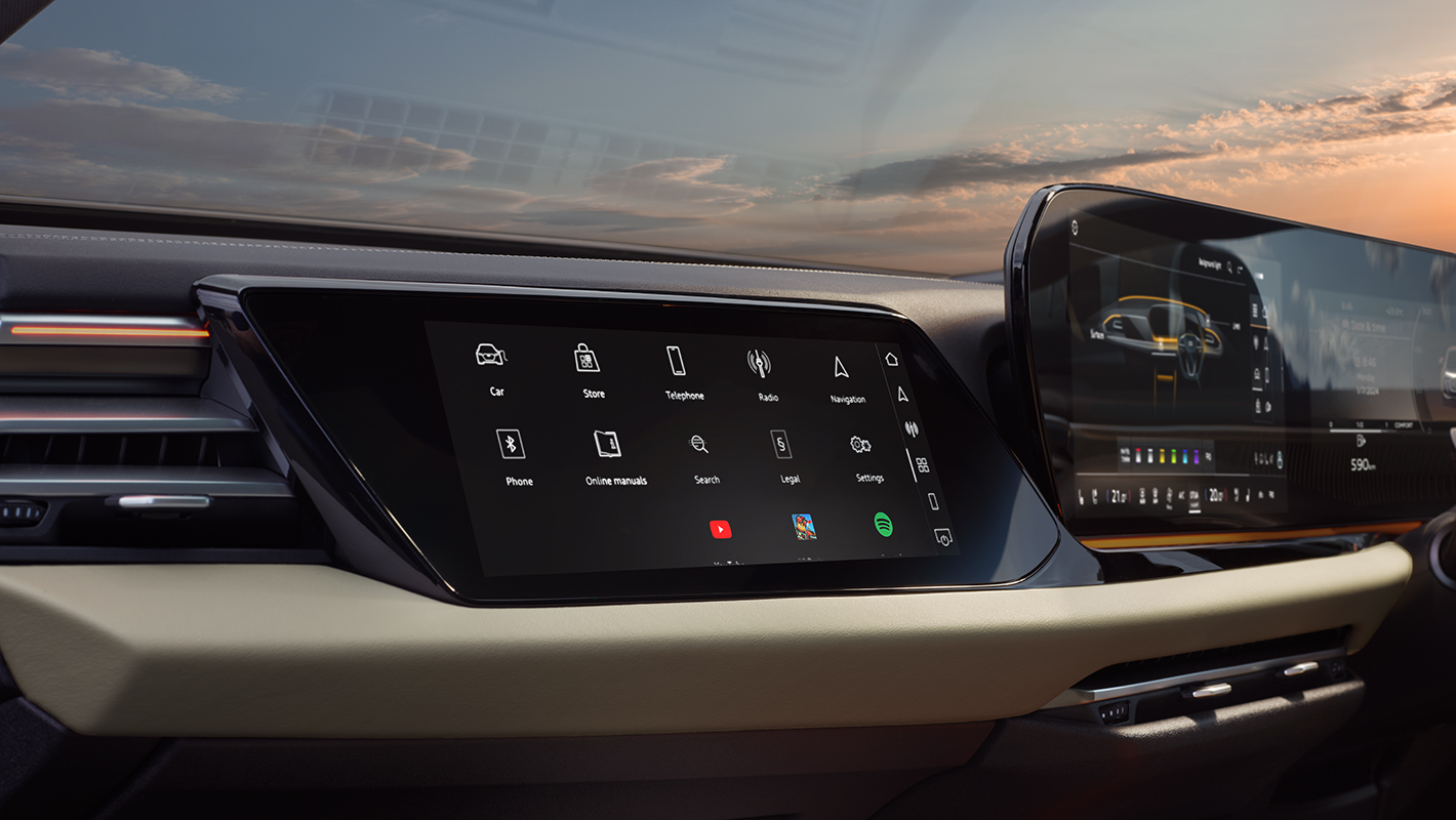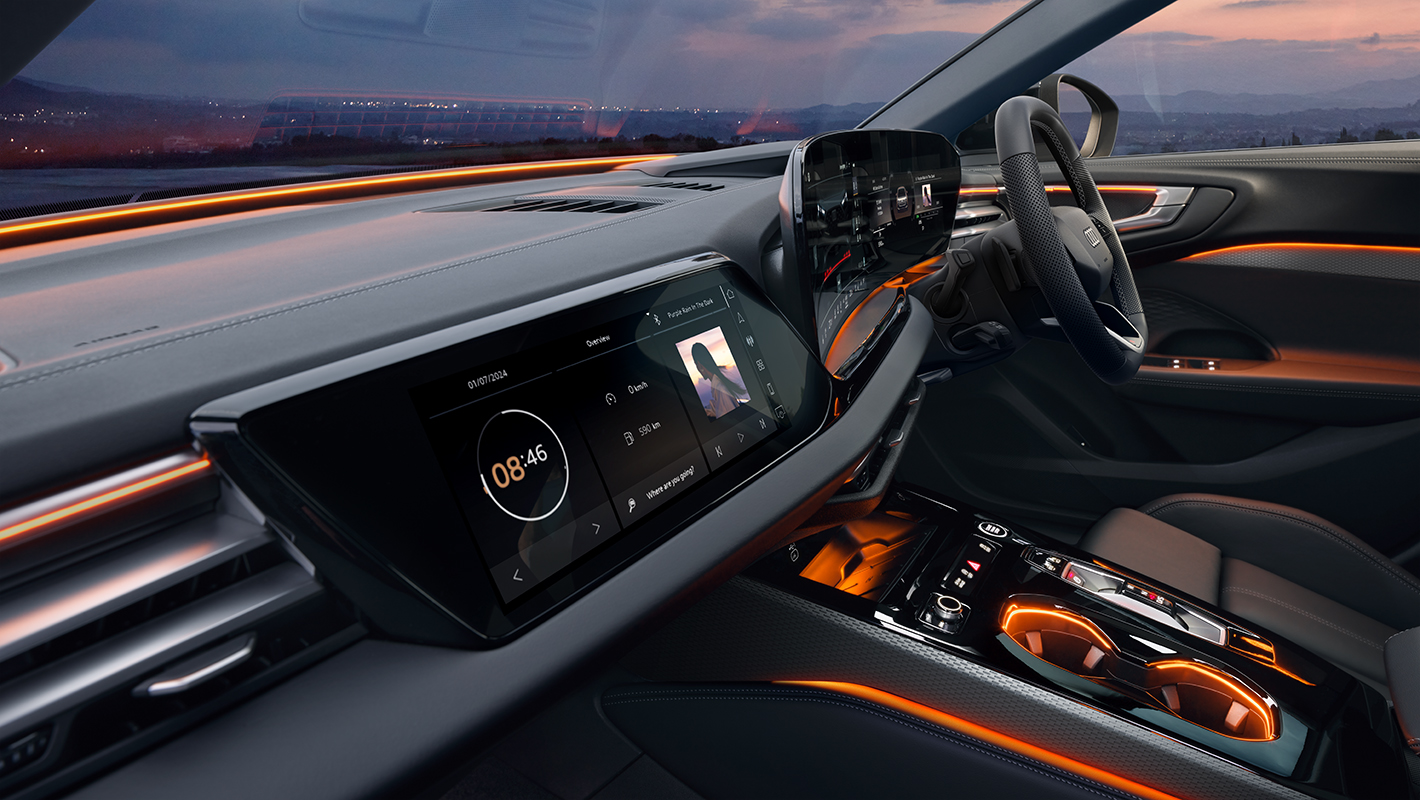 お好みの色を30色のカラーチャートの中から選び車内を自分好みのライティングで彩ることができます。ダッシュボードに大きな弧を描いて広がるダイナミックインタラクションライトは、インディケーターやハザードランプと連動して流れるように点灯し、作動状況を視覚化。また車両の施錠・解錠に合わせて点灯するウェルカム機能を備えます。