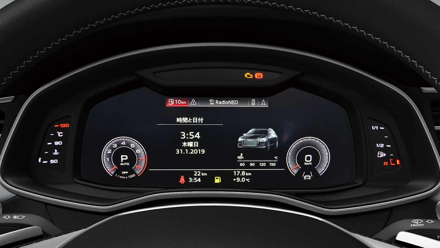 高解像度12.3インチカラー液晶フルデジタルディスプレイに、スピードメーター、タコメーター、マップ表示、ラジオ/メディア情報などフレキシブルに表示。操作もマルチファンクション付きステアリングホイールからダイレクトに行えます。またVIEWボタンを押すことで2つの円形メーターの大小切り替えも可能。メーター表示を小さくすれば、オンボードコンピューターやMMIナビゲーションのコンテンツ、3D地形図などをより見やすく画面の広いエリアに表示できます。ルートガイダンスを起動している間は、スピードメーター近くにナビゲーション情報が常時表示され、タコメーターにオンボードコンピューター数値の配置も可能です。