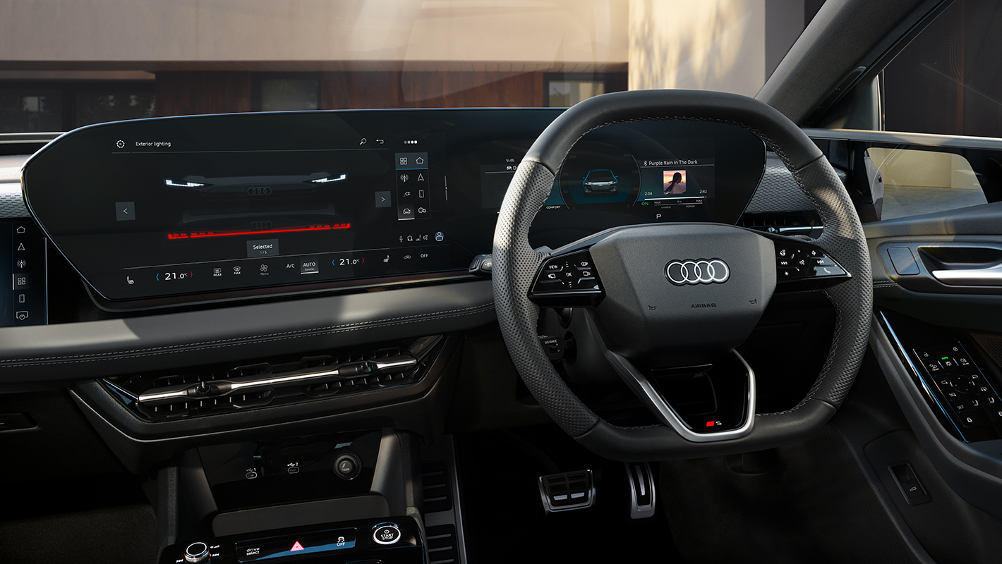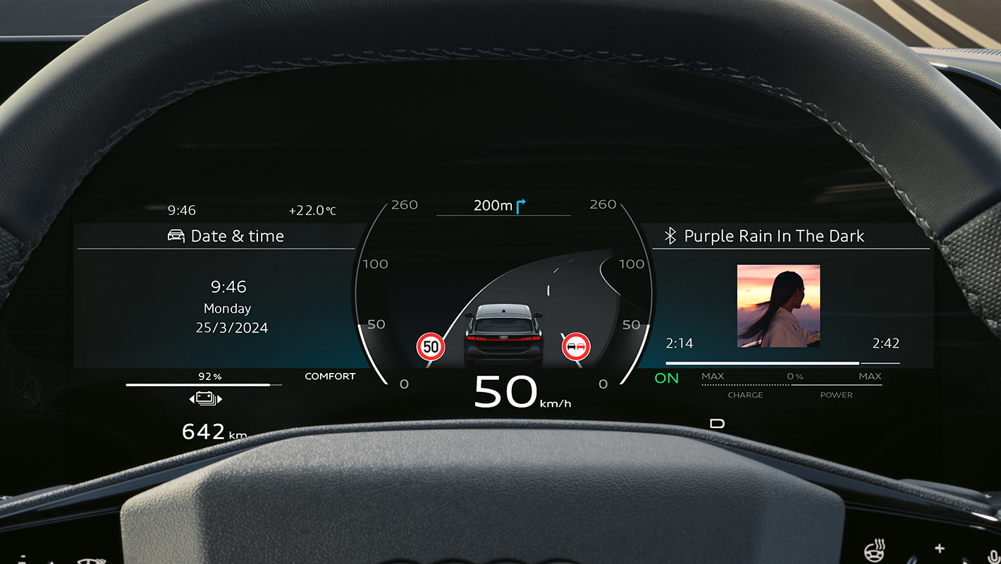 先進のデジタルステージがドライバーとパッセンジャー、乗る人すべてのデジタル体験を革新します。立体的にデザインされたダッシュボードには、美しく先進的なMMIパノラマディスプレイが統合され快適な操作環境を実現。助手席側のMMIパッセンジャーディスプレイ*は映像の視聴や充電ステーションの検索などが可能です。またバーチャルエクステリアミラー*のOLEDディスプレイは上質なインテリアに美しくなじみながら、目線の高さを考慮した見やすい位置に設置され、自然な視線移動で後方をクリアに確認することができ電動格納も可能です。