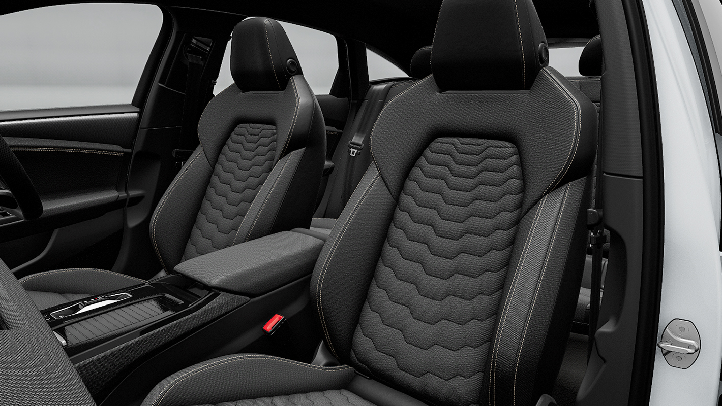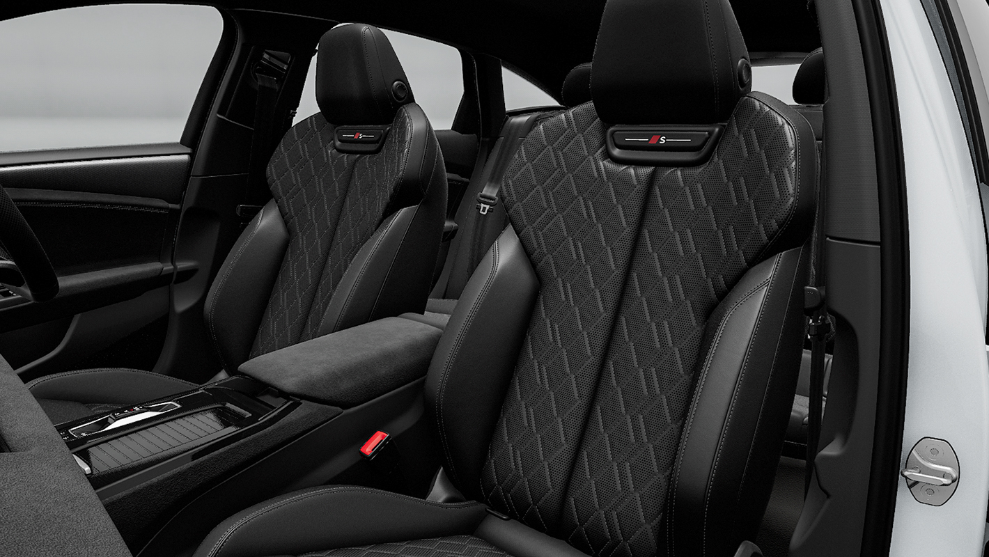 一体型ヘッドレストを備えたホールド性の高いスポーツシート。シートサイドボルスターはコーナリングの際、身体をしっかりサポートする形状に。パーフォレイテッド加工が施され、シートベンチレーション機能を搭載。マッサージ機能も備えています。バックレストのSロゴ、上質で温かみのあるファインナッパレザー、コントラストのある印象的なダイヤモンドステッチが、スポーティでエレガントな雰囲気を際立たせます。