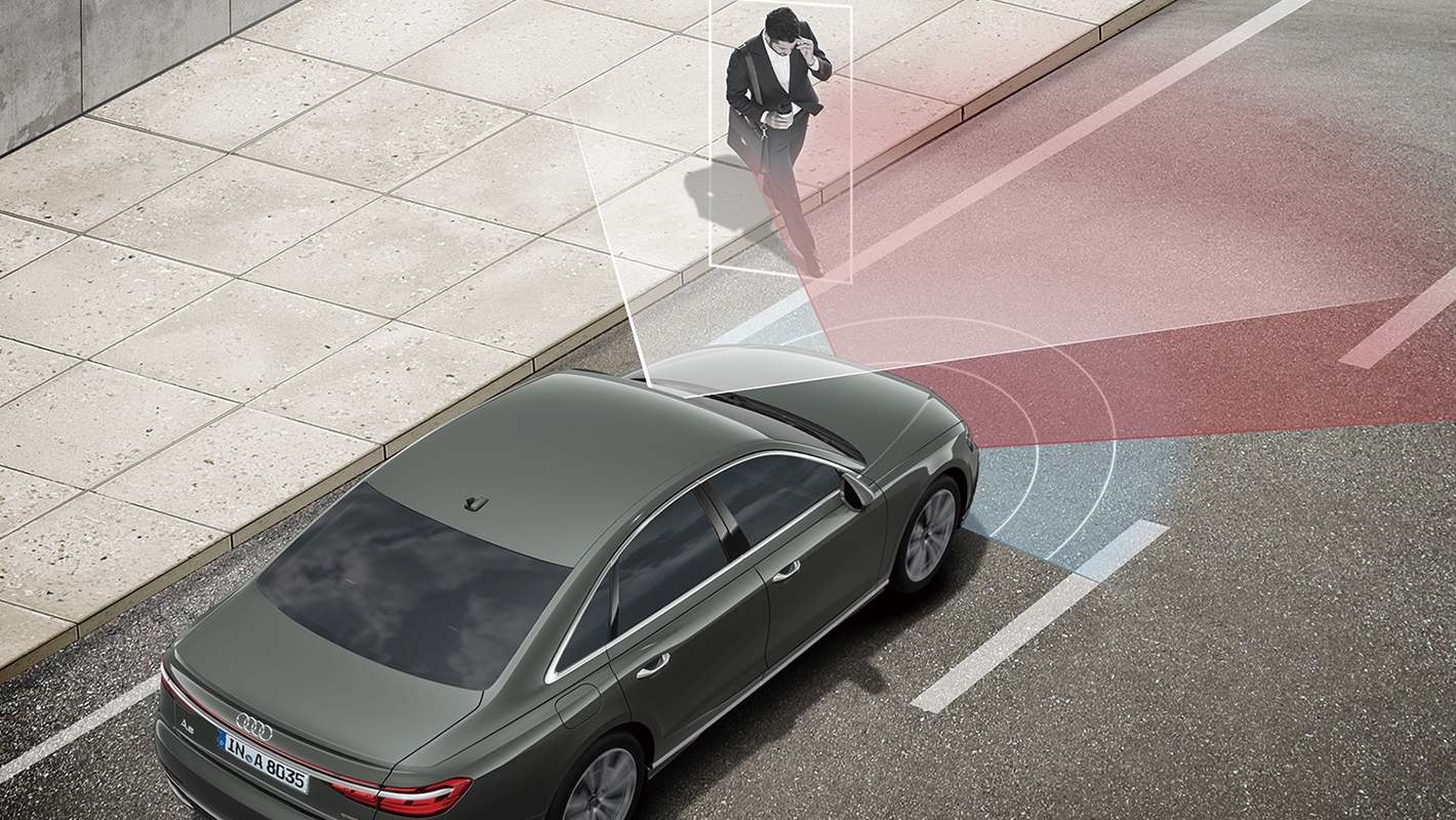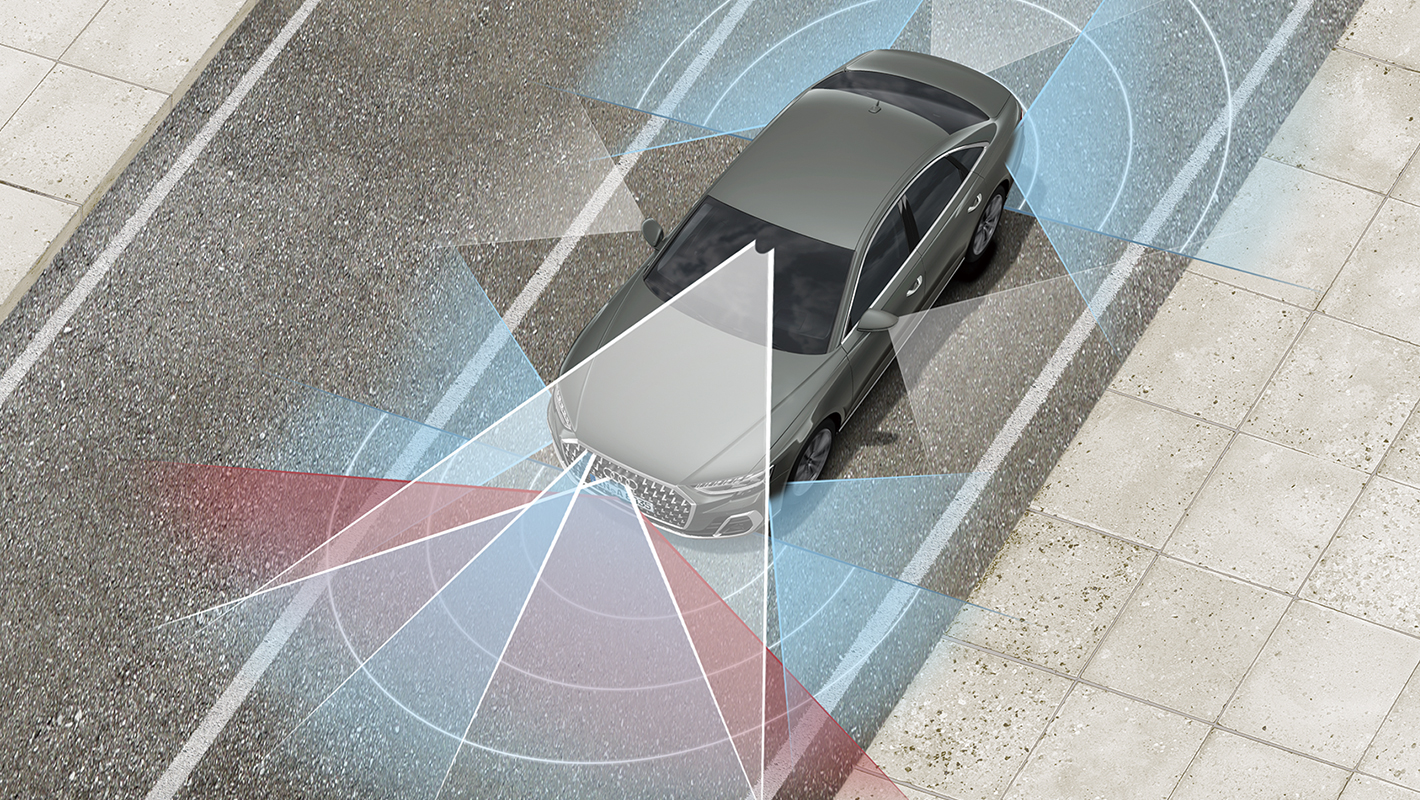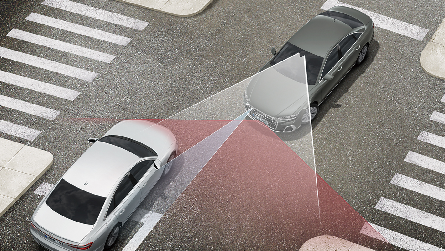 フロントクロストラフィックアシストの機能として、車両の左右から接近する車両を監視。衝突されるリスクが検知された場合、アウディプレセンスベーシックを起動します。アウディプレセンスベーシック、アウディプレセンスリヤと連携し、全周囲からの衝突に備えることができます。