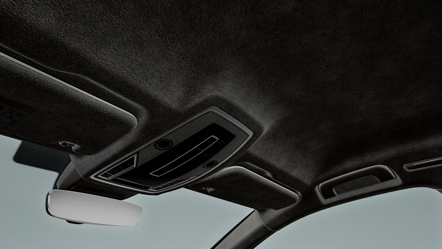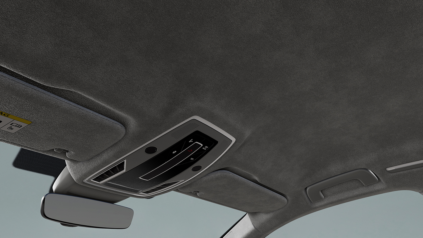 リサイクルポリエステルを用いて作られるスエード調人工皮革を使ったヘッドライニング。