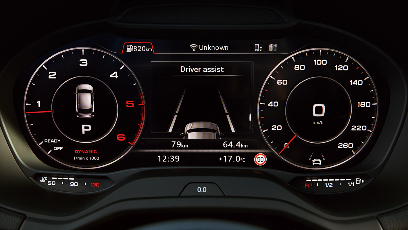 高解像度12.3インチカラー液晶フルデジタルディスプレイに、スピードメーター、タコメーター、マップ情報、Audi connectサービス、ラジオ/メディア情報をフレキシブルに表示。操作もマルチファンクション付きステアリングホイールでダイレクトに行えます。またVIEWボタンを押すことでメーター表示を小さくすれば、オンボードコンピューターやMMIナビゲーションのコンテンツ、3D地形図などをより見やすく画面の広いエリアに表示できます。運転中に必要な情報を目前に集約することで、視線移動を抑えドライビングの集中を妨げません。