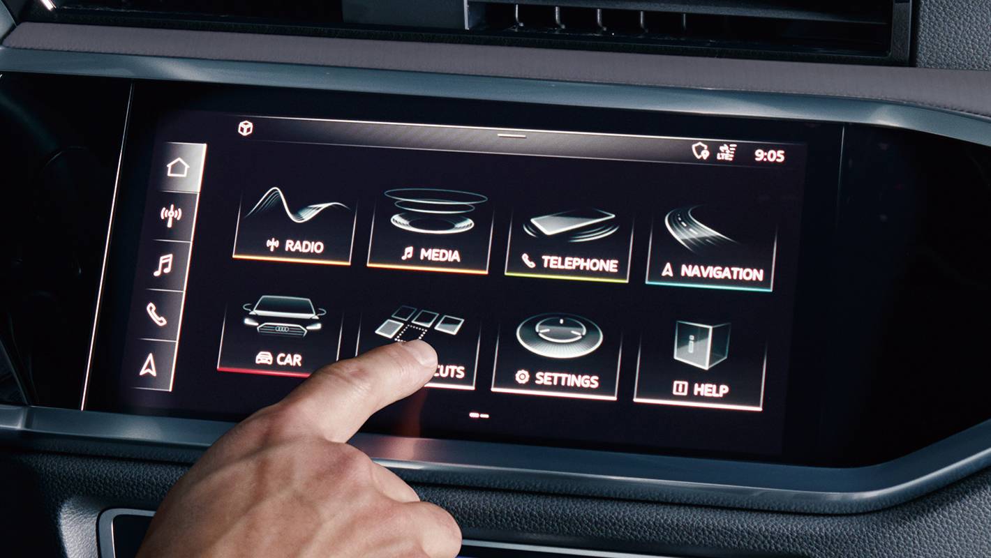 デジタル時代にふさわしいユーザーインターフェースであるMMIナビゲーション。ボタンやスイッチに代わり、高解像度10.1インチのタッチパネルで車両のセッティングやインフォテインメント、ナビゲーションマップを直感的に操作することが可能。ドラッグ操作により、ホーム画面のアイコンを自分の好みに並び替えることができます。