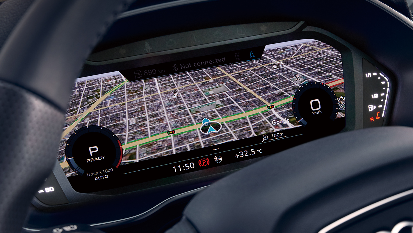 高解像度10.25インチカラー液晶フルデジタルディスプレイに、スピードメーター、タコメーター、マップ表示、ラジオ/メディア情報などをフレキシブルに表示。メーター表示の大きさを切り替えたり、3Dの地形図を大きく映し出したりすることが可能です。操作はステアリングホイールのボタンから行うことができます。運転中に必要な情報を目前に集約することで視線移動を抑えドライビングの集中を妨げません。