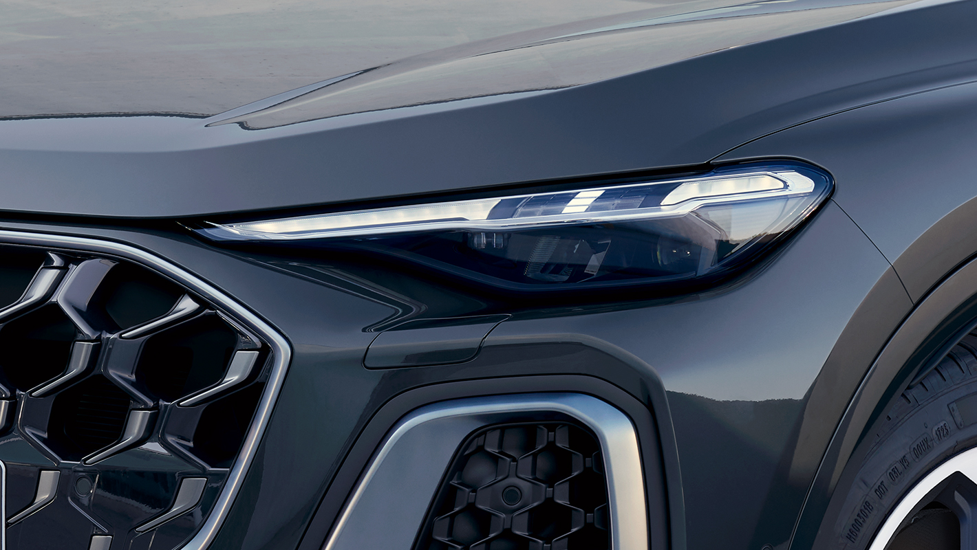 ひと目見てプレミアムSUVらしい精悍さを感じさせるフロントフェイス。高い位置に配したフラットでワイドなシングルフレームグリルには、ブランドを象徴する2次元デザインのAudi ringsが輝きを添えます。グリル下には大型エアインテークが配置され、スポーティなキャラクターを演出。鋭い眼差しのマトリクスLEDヘッドライトと相まって、ワイドな印象を際立たせます。S lineパッケージ*を選択すれば、シングルフレームグリルは大開口のハニカムメッシュになり、エアインテークは力強さを感じさせるワイドなデザインになります。