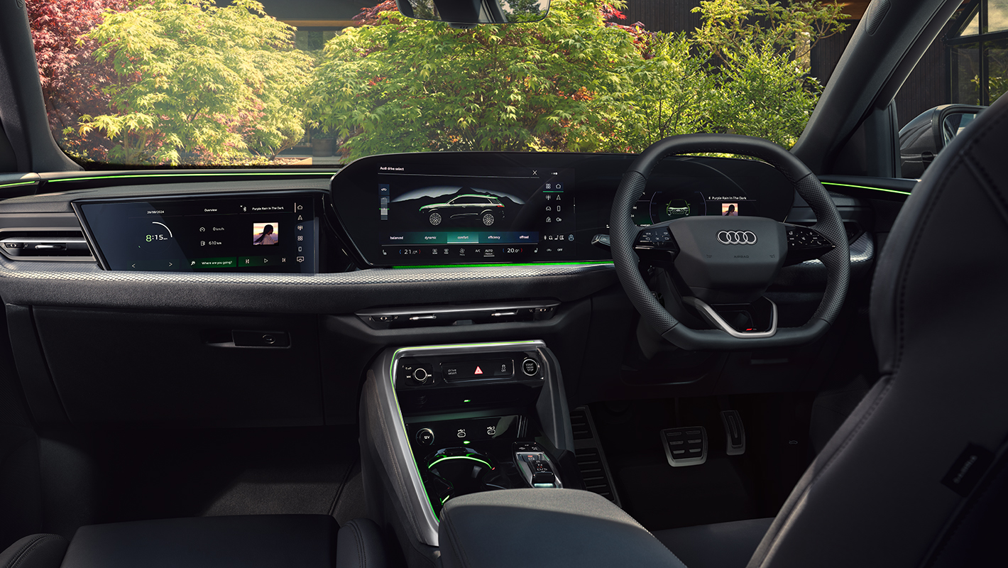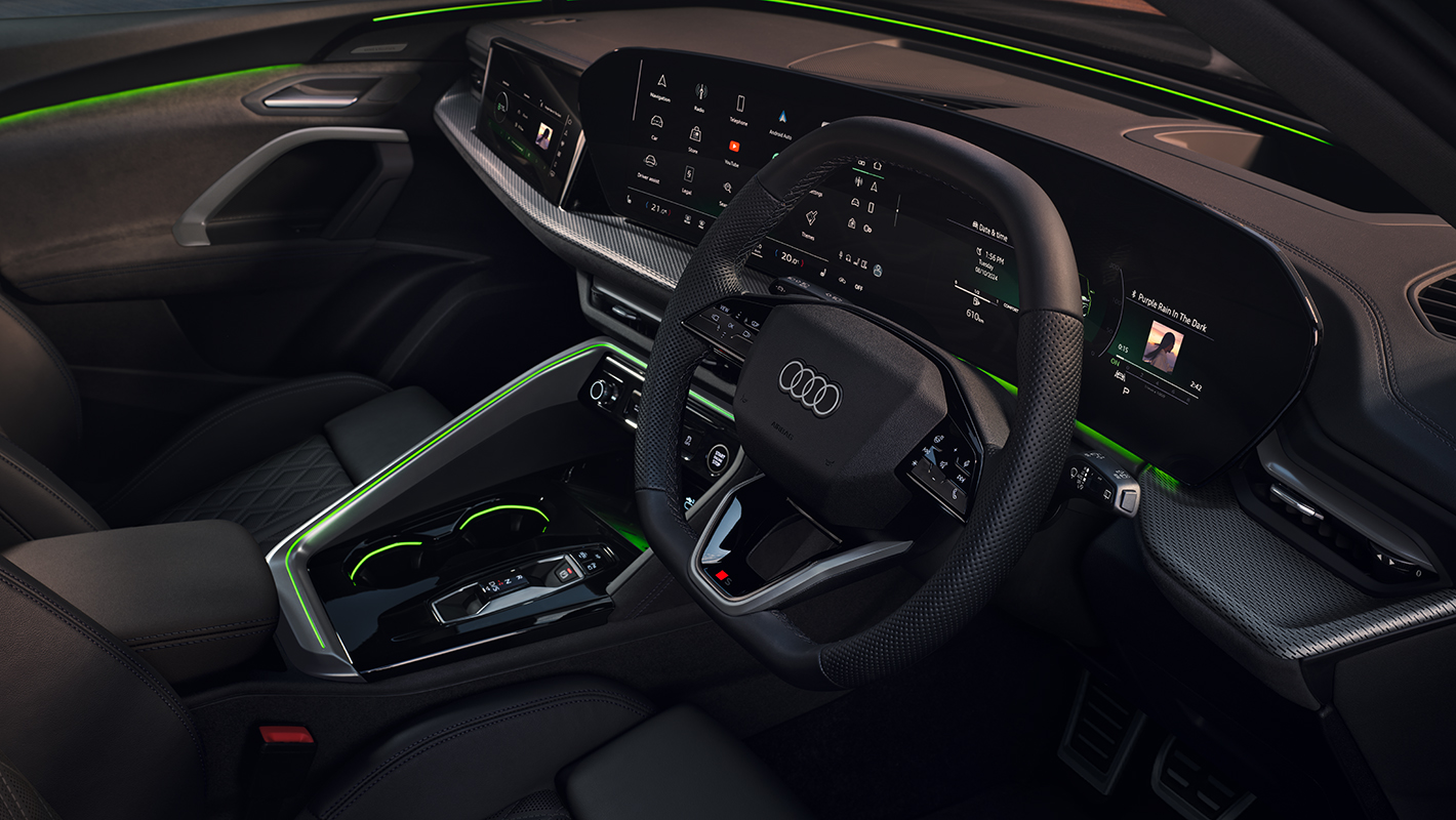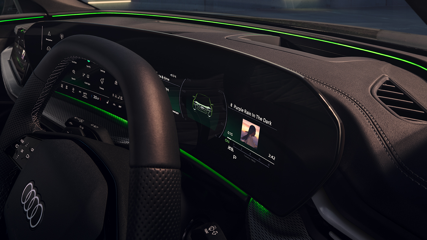 洗練されたデジタルインテリア体験をもたらすMMIパノラマディスプレイ。OLED技術を採用し、視認性に優れた曲面デザインで、11.9インチのバーチャルコックピットプラスと14.5インチのMMIタッチディスプレイがシームレスにつながります。MMIタッチディスプレイは、ナビゲーションマップや様々なインフォテインメント、車両のセッティングを直感的に操作することが可能。操作はタッチコントロールと音声によるアウディアシスタントに対応。アウディアシスタントは「Hey Audi」と発声するか、ステアリングのトークボタンから起動できます。AI音声アシスタントとして、車両機能の実行、目的地の検索、空調の調整などの制御機能を備えています。また、スマートフォンを介さずにAudi Application Storeから様々なサードパーティアプリを直接ダウンロードすることができます。