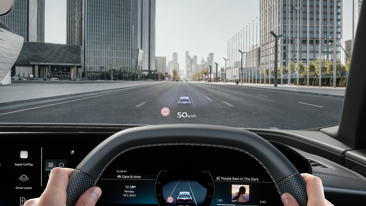 車速、アシスタンスシステムに関する情報、ナビゲーションの指示、警告、音楽などのコンテンツの操作画面を、ドライバー正面のフロントウィンドウ上に必要に応じて投影します。高さ調整が可能で、読みやすいコントラストのマルチカラーで情報を表示します。