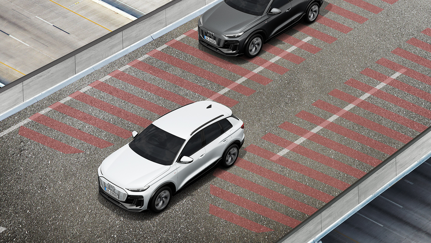 システムがパーキングスペースを検知し、理想的な駐車経路と退出経路を算出。ステアリング/アクセル/ブレーキの操作、モーターの停止を行います。ドライバーは駐車プロセスを監視するだけでクルマをスムーズに駐車スペースへ移動することができます。経路上に障害物が検出されると自動的にブレーキが作動します。MMIタッチディスプレイから起動できます。