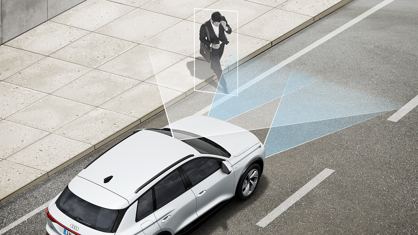 駐車スペースなどからバックして路上に出る際に、左右から接近する車両を監視。衝突の危険を乗員に警告します。ドライバーへの警告はMMIタッチディスプレイへの表示と音声で行われます。危険な状況にあるとシステムが判断すると、ブレーキが作動します。