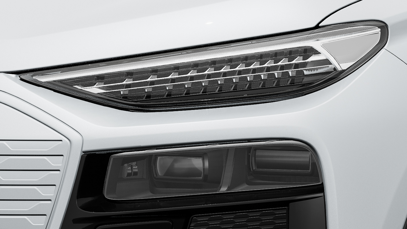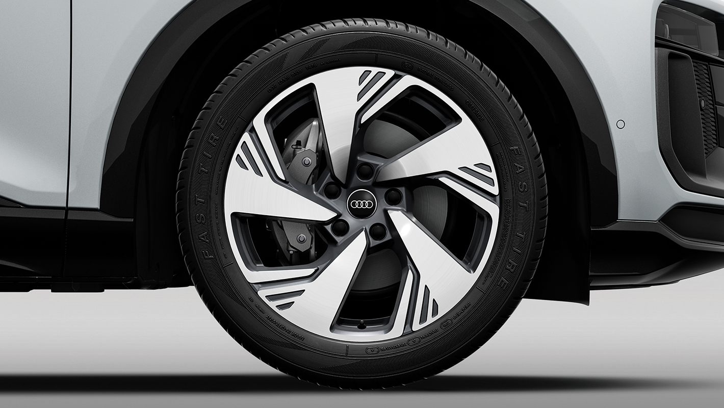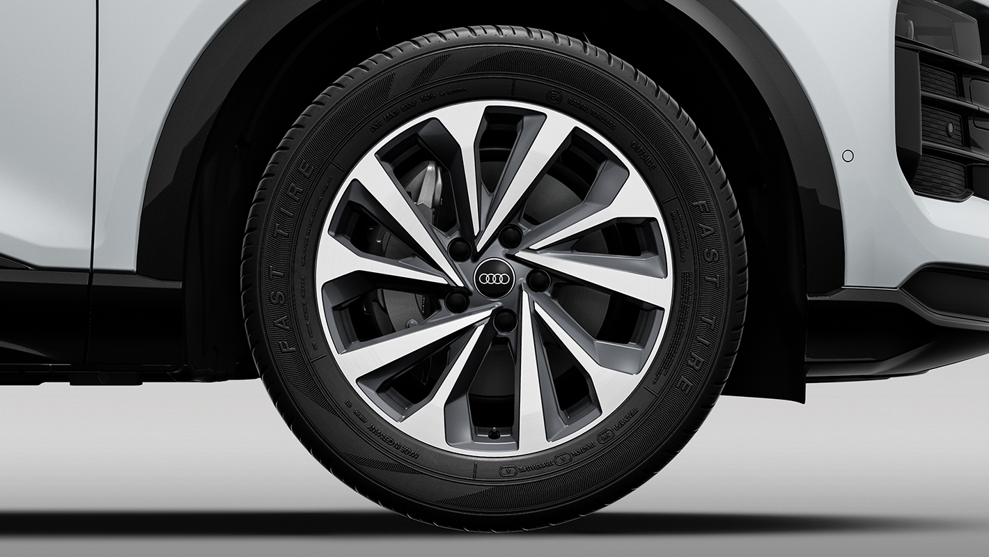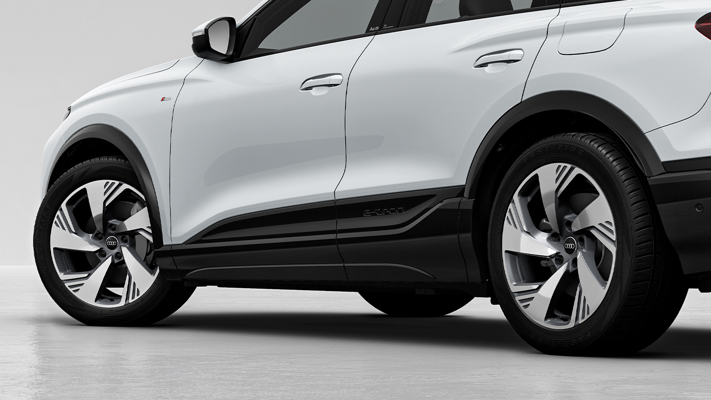 Audi Q6 e-tronの先進性とダイナミズムに満ちた姿をスタイリッシュに磨き上げたadvanced。フロントからボディサイド、リヤにかけてミトスブラック メタリックのコントラストペイントが彩り、力強いボディを引き締めます。ホイールは18インチを標準装備。オプションのPlusパッケージを選べば19インチのアルミホイールとなり、Audi Q6 e-tronの躍動感を際立たせます。