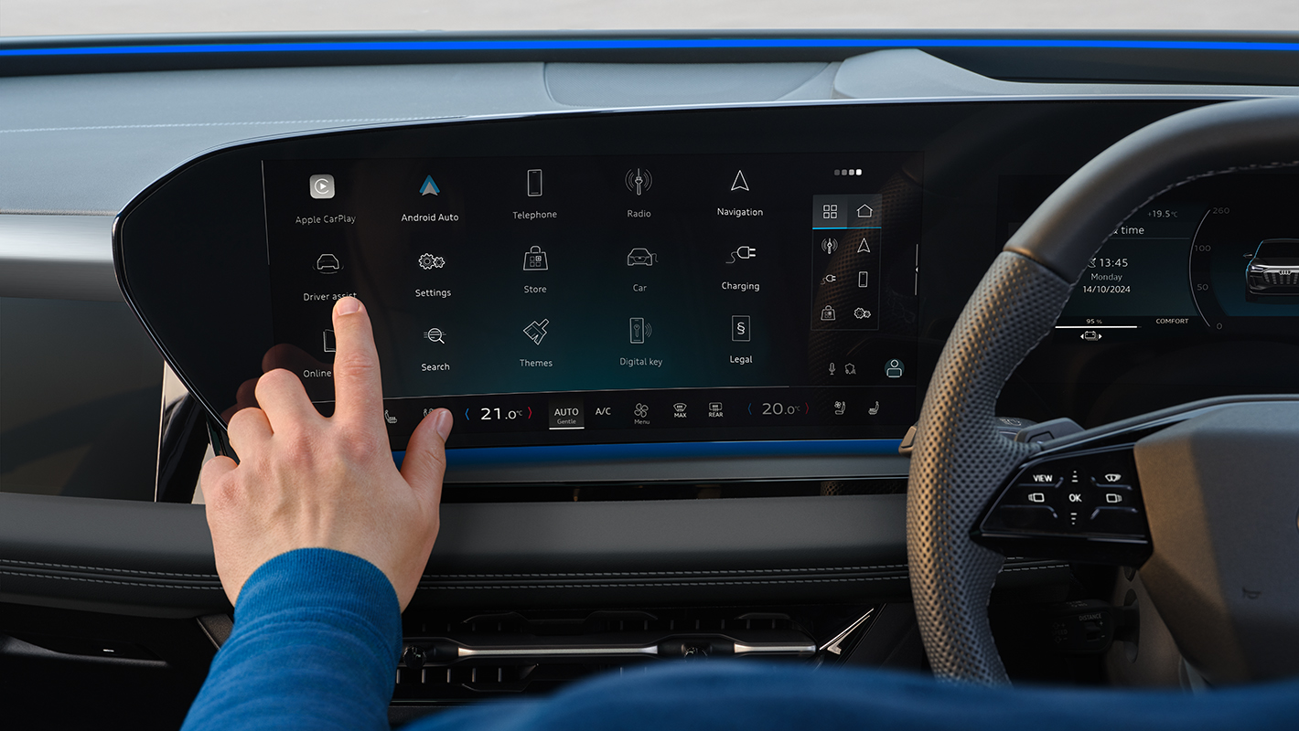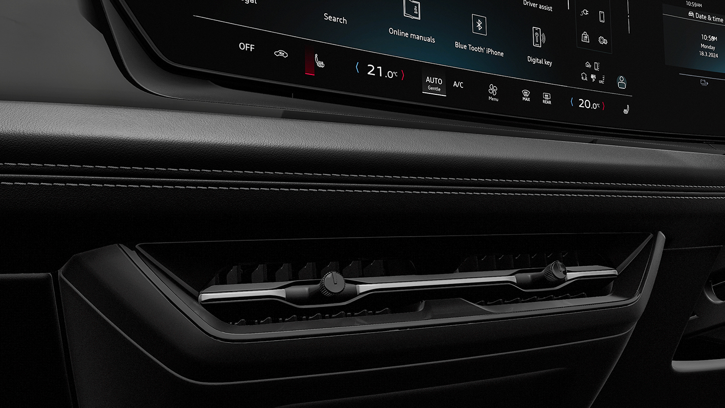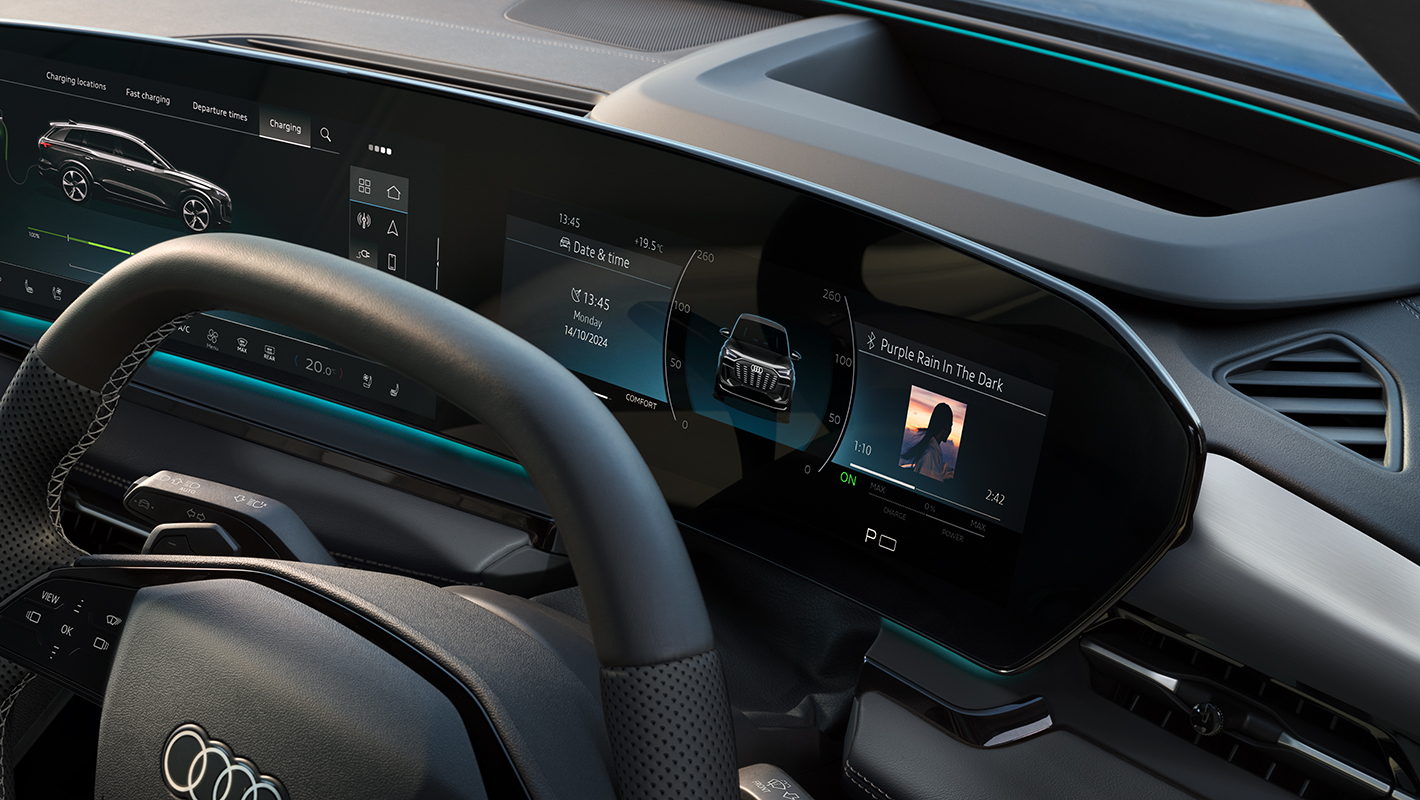 洗練されたデジタルインテリア体験をもたらすMMIパノラマディスプレイ。OLED技術を採用し、視認性に優れた曲面デザインで、11.9インチのバーチャルコックピットプラスと14.5インチのMMIタッチディスプレイがシームレスにつながります。MMIタッチディスプレイは、ナビゲーションマップや様々なインフォテインメント、車両のセッティングを直感的に操作することが可能。操作はタッチコントロールと音声によるアウディアシスタントに対応。アウディアシスタントは「Hey Audi」と発声するか、ステアリングのトークボタンから起動できます。AI音声アシスタントとして、車両機能の実行、目的地の検索、空調の調整などの制御機能を備えています。また、スマートフォンを介さずにAudi Application Storeから様々なサードパーティアプリを直接ダウンロードすることができます。
