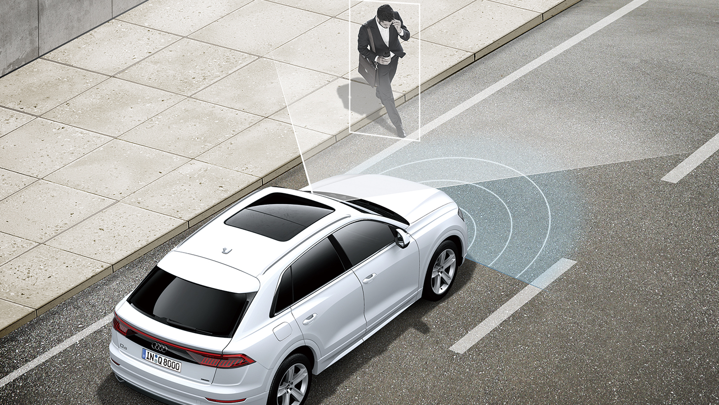 フロントクロストラフィックアシストの機能として、車両の左右から接近する車両を監視。衝突されるリスクが検知された場合、アウディプレセンスベーシックを起動します。アウディプレセンスベーシック、アウディプレセンスリヤと連携し、全周囲からの衝突に備えることができます。