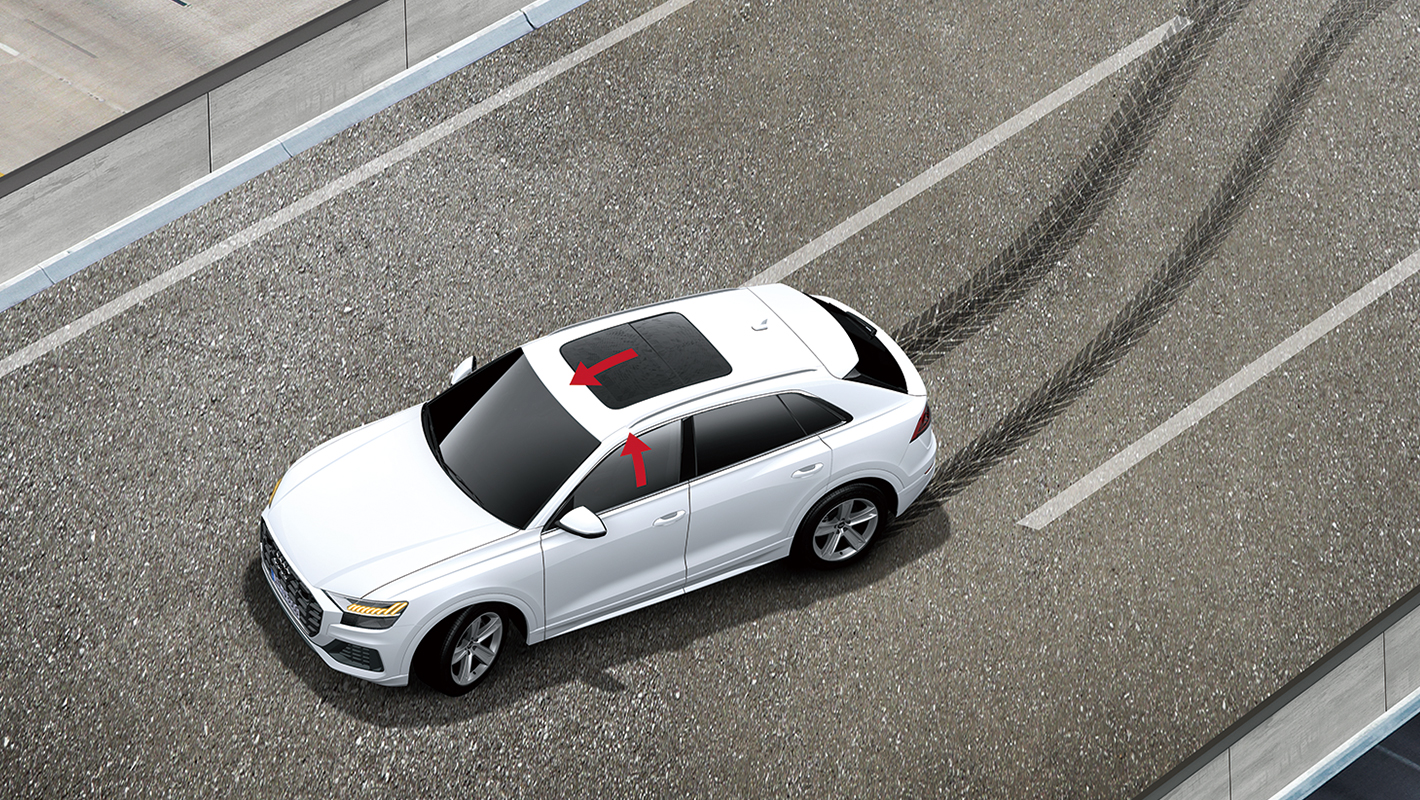 運転中およびアクティブレーンアシストの作動中にドライバーの反応がなかった場合に表示や音などで警告。危険を察知しシステムの限度内で反応しなければ、システムがクルマのコントロールを引き受け、走行レーン内に自動で停止させます。アウディプレセンスを起動させ、乗員のレスキューに備え、自動でエマージェンシーコールにつなぎます。