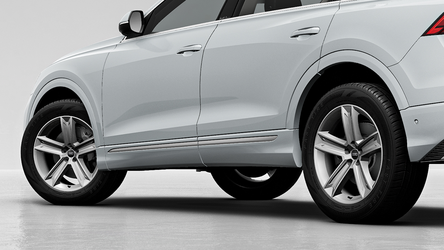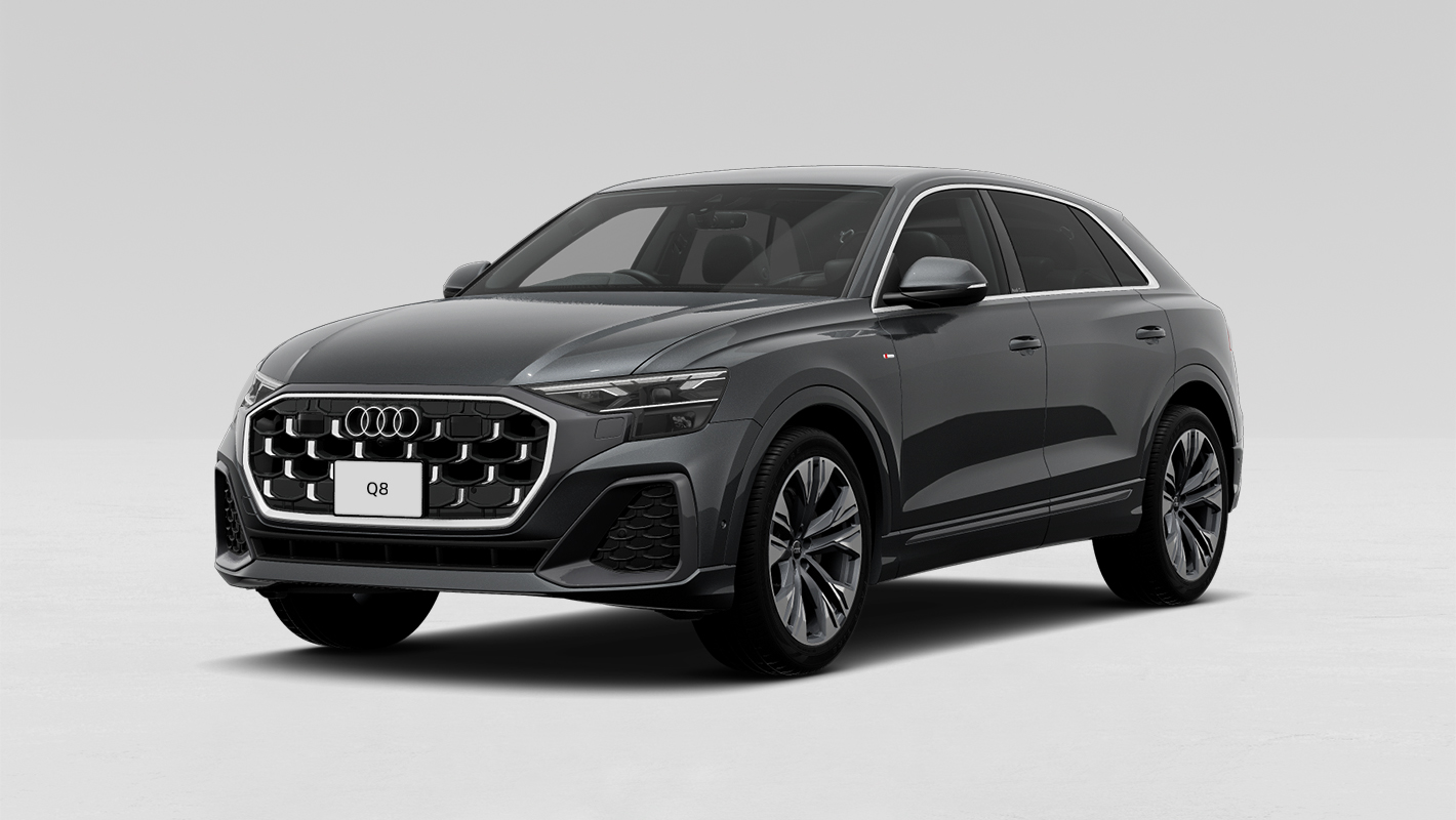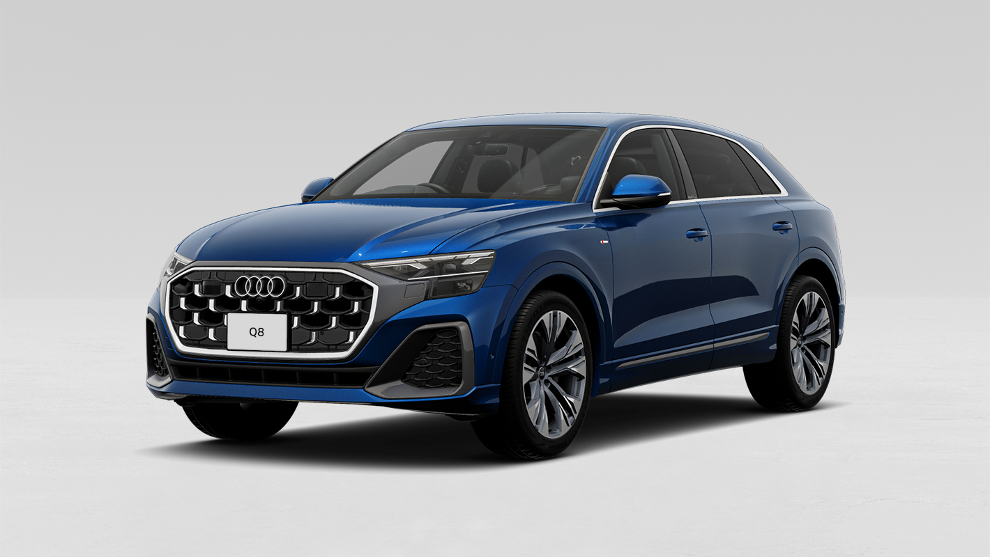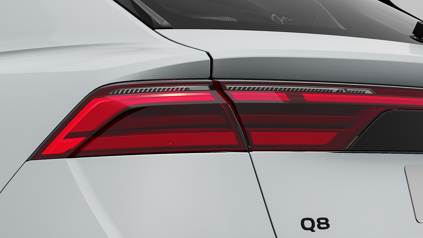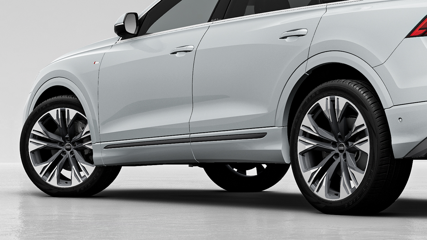 Audi Q8から、さらにスポーティな魅力をこの上なく引き出すS lineのエクステリア。グリルの周りをグレーで囲い込むことでよりワイド&ローのスタンスを強調。L字型の加飾を施したS line専用グリル。ボディ同色のS lineバンパーと大型のエアインレットが一体感を高め、スポーティネスとダイナミズムを併せ持つ印象的なフロントエンドを生み出します。