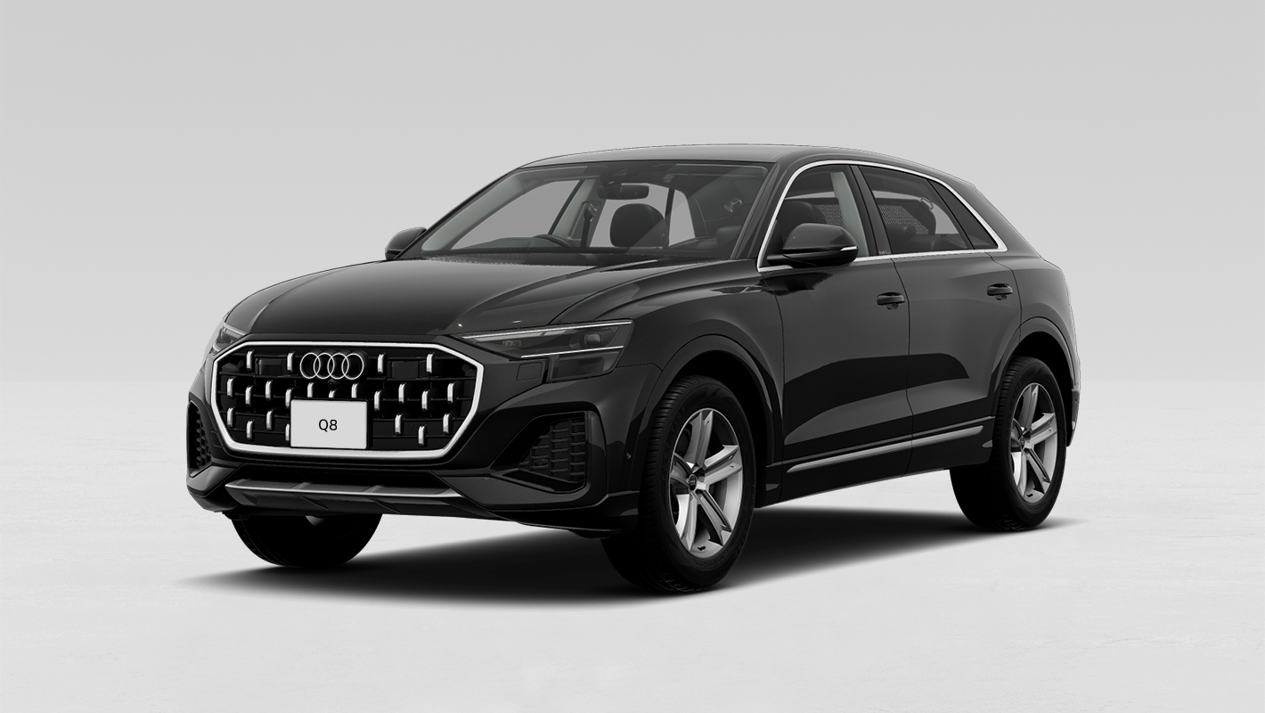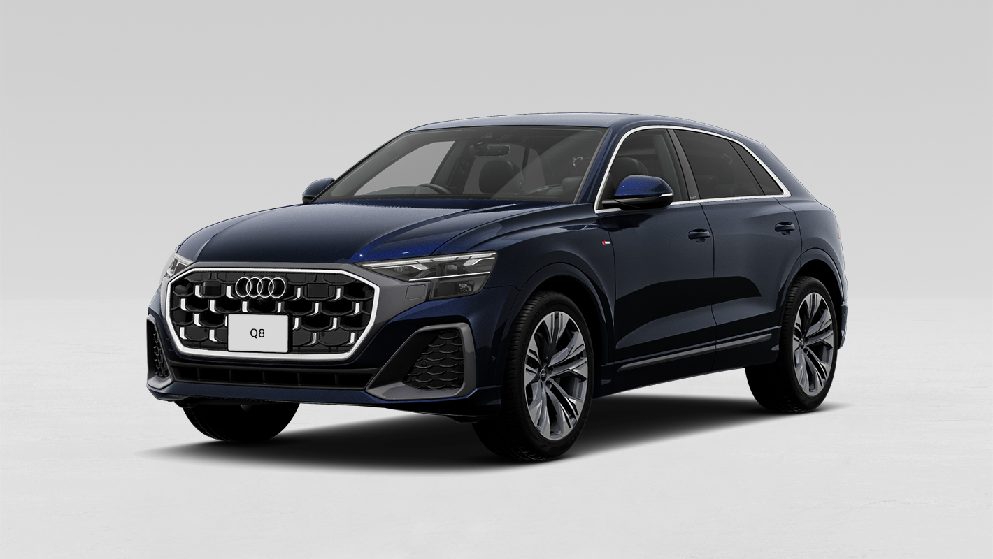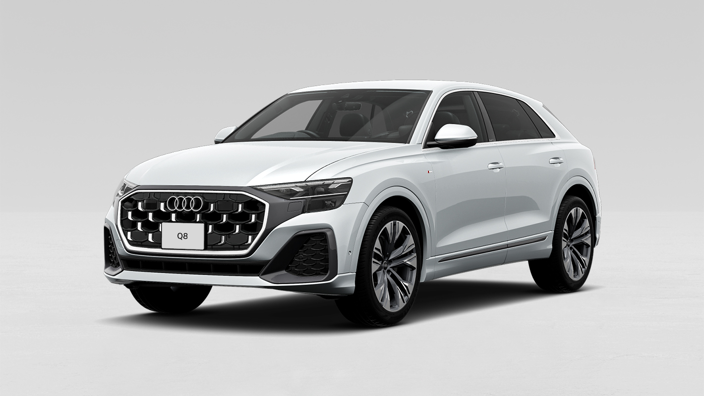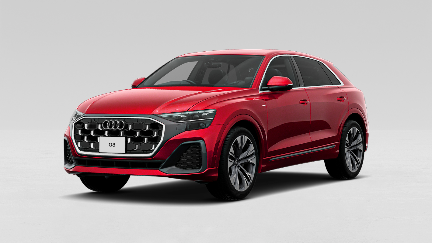 Audi Q8から、さらにスポーティな魅力をこの上なく引き出すS lineのエクステリア。グリルの周りをグレーで囲い込むことでよりワイド&ローのスタンスを強調。L字型の加飾を施したS line専用グリル。ボディ同色のS lineバンパーと大型のエアインレットが一体感を高め、スポーティネスとダイナミズムを併せ持つ印象的なフロントエンドを生み出します。