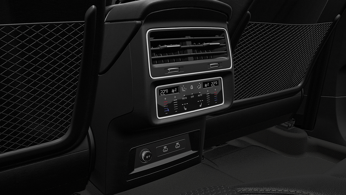 運転席と助手席に加え、タッチ式A/Cコントロールパネルにより、後部座席の左右の温度設定と風量を個別に調整可能。乗員認識機能により、効率的に温度ゾーンを調整します。センターコンソールに加えて、Bピラーにもエアベントを配置しています。エアクオリティセンサーと太陽光に応じた調節機能を用いた自動内気循環、埃や臭いを取り除くアレルゲン除去フィルターで室内の空気を清浄に保ちます。余熱の利用により、暖房もより効果的に行います。