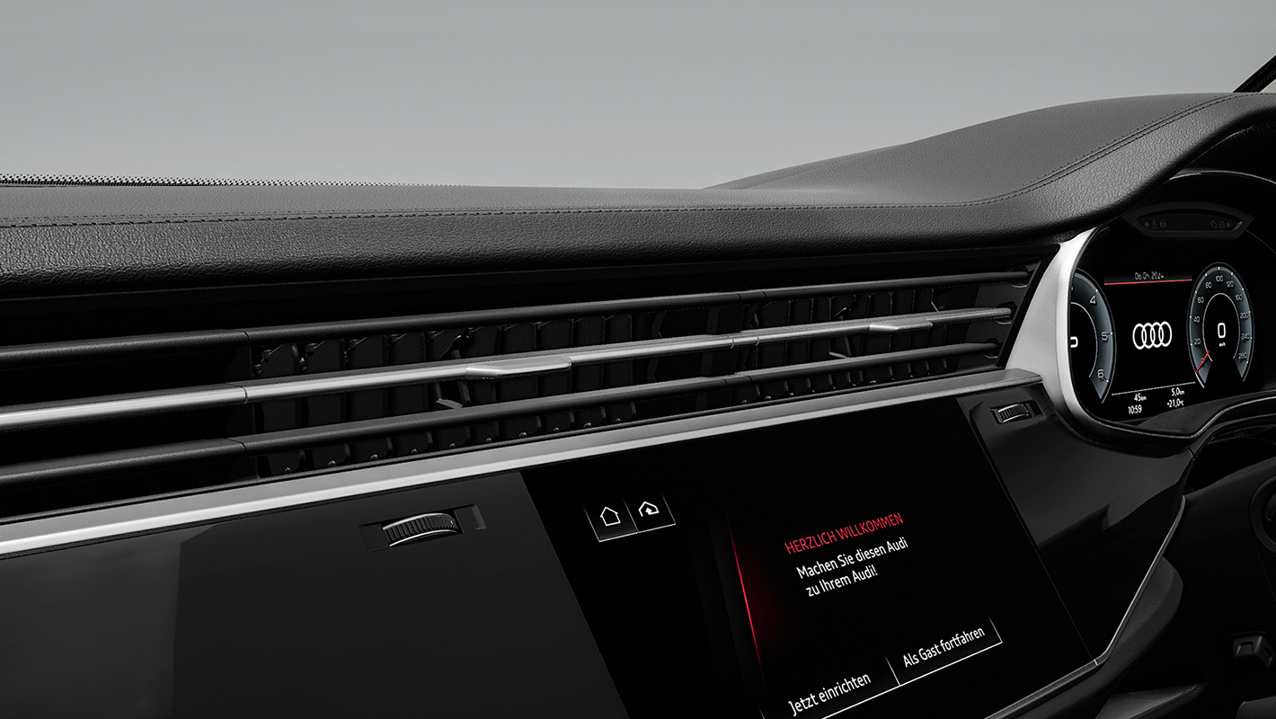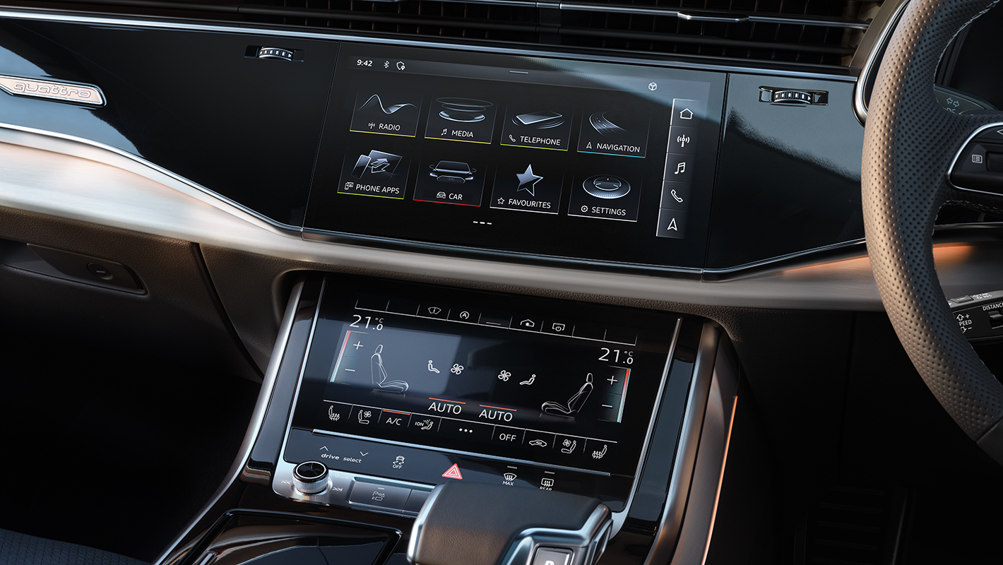 デジタル時代にふさわしいユーザーインターフェースであるMMIタッチレスポンスは、フラットな高解像度モニターで車両のセッティングやインフォテインメントを直感的に操作することが可能。グラフィックや振動、音によって、視覚、触覚、聴覚に明確な反応を感じ取れます。インフォテインメント用の10.1インチアッパースクリーンと、空調操作や手書き文字入力用の8.6インチローワースクリーンの2つのタッチディスプレイを搭載。イグニッションをOFFにするとスクリーンが漆黒のフラットなブラックパネルとなり、周囲のインテリアに溶け込みます。
