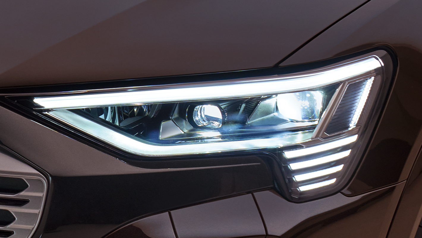 Audiが指し示すデジタル化の未来を体現するAudi Q8 e-tron。デジタルマトリクスLEDヘッドライト*や、バーチャルコックピット、小型カメラで捉えた車両後方の映像を車内のOLEDディスプレイに映し出すバーチャルエクステリアミラー*など革新的なテクノロジーを採用。デザインとテクノロジーをシームレスに融合させ、新しいドライビングプレジャーを実現します。