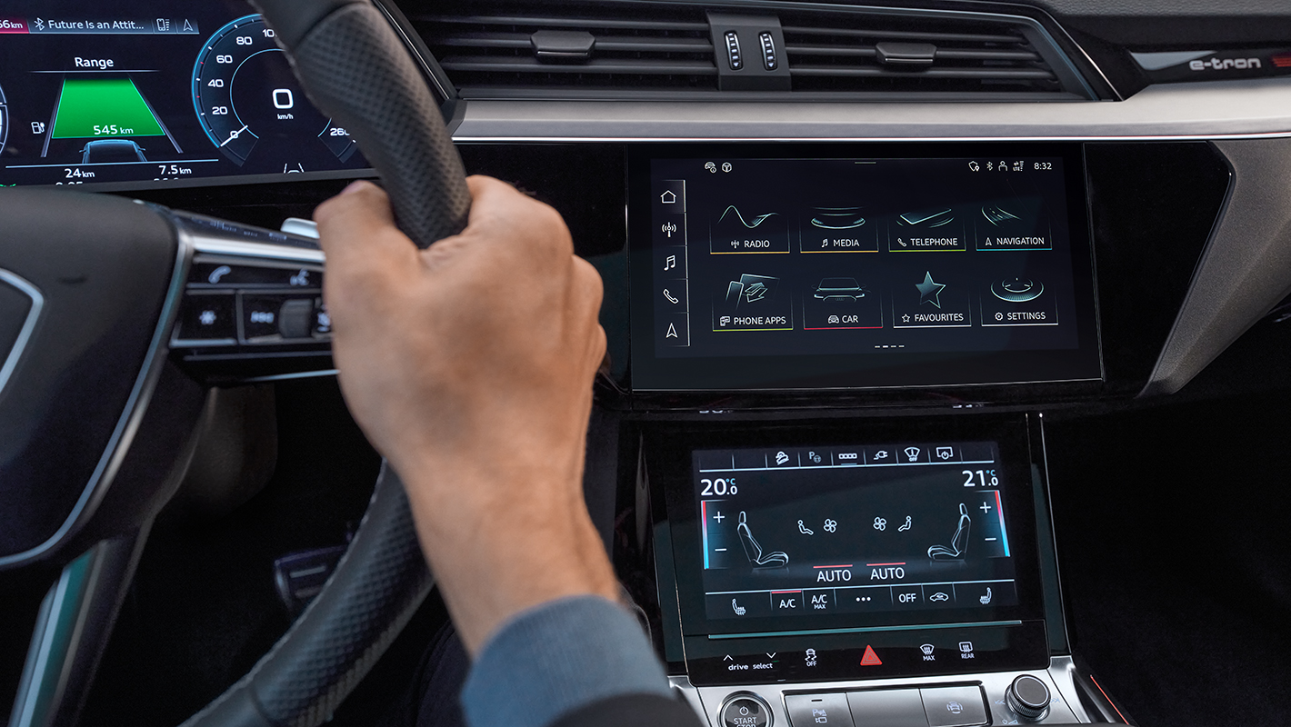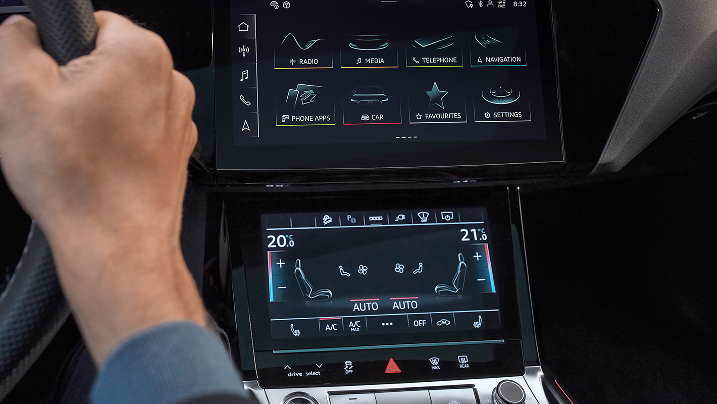 デジタル時代にふさわしいユーザーインターフェースであるMMIタッチレスポンスは、フラットな高解像度モニターで車両のセッティングやインフォテインメントを直感的に操作することが可能。グラフィックや振動、音によって、視覚、触覚、聴覚に明確な反応を感じ取れます。インフォテインメント用の10.1インチアッパースクリーンと、空調操作や手書き文字入力用の8.6インチローワースクリーンの2つのタッチディスプレイを搭載。イグニッションをOFFにするとスクリーンが漆黒のフラットなブラックパネルとなり、周囲のインテリアに溶け込みます。