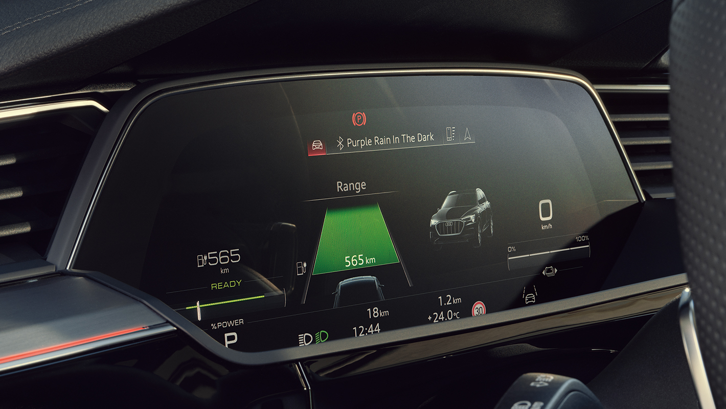 高解像度12.3インチカラー液晶フルデジタルディスプレイに、ドライバーに必要な情報を目前に表示。スピードメーター、パワーメーターの大きさをステアリングホイールのボタンで変更可能。ナビゲーション、アシスタンスの稼働状況などに加え、充電や回生システム、EV走行などの情報を、目線を前方からそらさずに確認できます。MMIナビゲーションとは異なる地図の縮尺、設定で表示ができます。