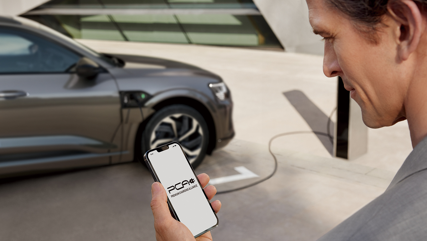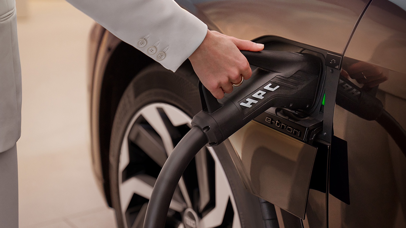 Audi Q8 e-tronは、充電器を差し込むだけで簡単に充電が可能。ご自宅での普通充電*¹はもちろん、外出時も各地で増え続ける普通充電・急速充電施設*²の利用ができます。150kWまでの急速充電器に対応しており、バッテリー容量10%から80%までの充電がAudi Q8 50 e-tronは約28分*³、Audi Q8 55 e-tronは約34分*³で完了します。充電中は、クルマから離れていてもスマートフォンのmyAudiアプリから充電状況をいつでも確認できます。