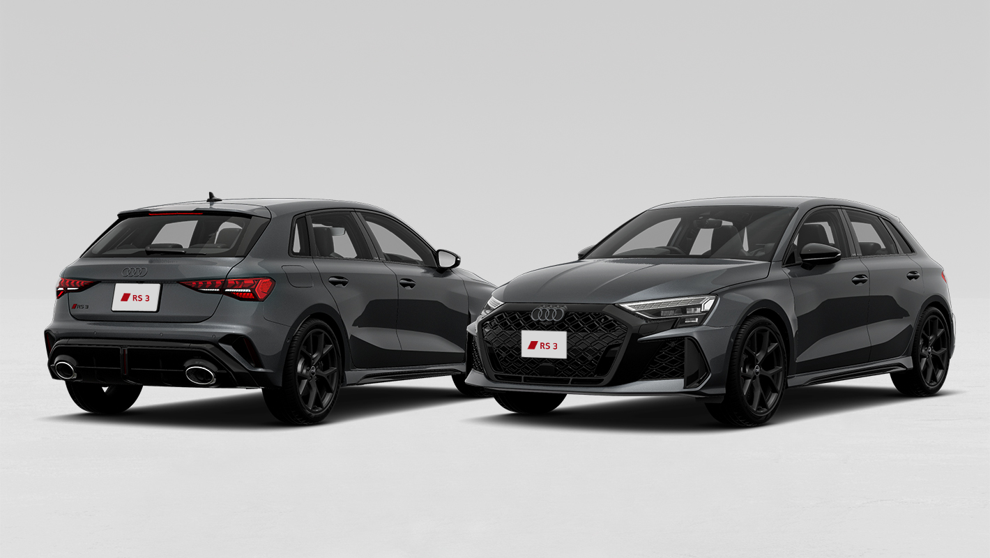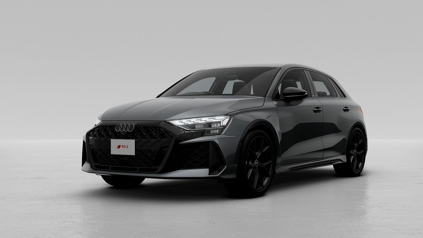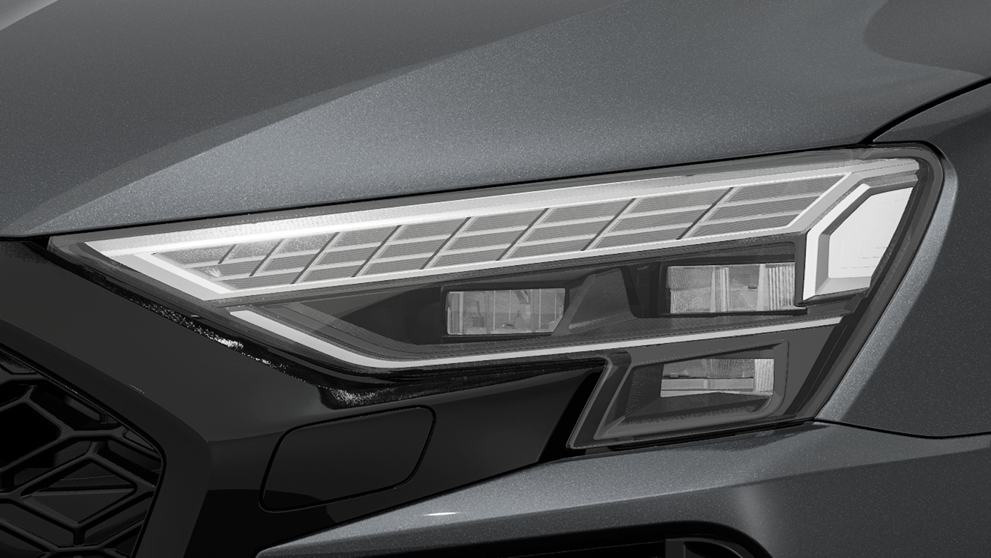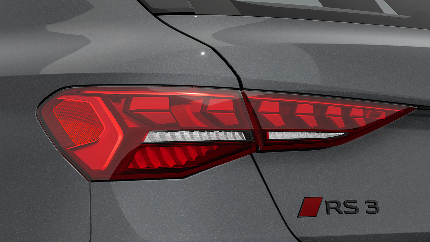 ダイヤモンドパターンのグリルとハイグロスブラック仕上げのシングルフレームグリル、大型のエアインテークを備えたRSバンパーが、Audi RS 3の躍動感を強調。モータースポーツから着想を得たリヤデザインは、RS専用大型リヤディフューザーやオーバル形状のテールパイプが独特の存在感を醸し出します。革新的なマトリクスLEDヘッドライトには、チェッカーフラッグデザインのデジタルデイタイムランニングライトも備え、視覚的にそのパフォーマンスを表現しています。
