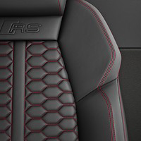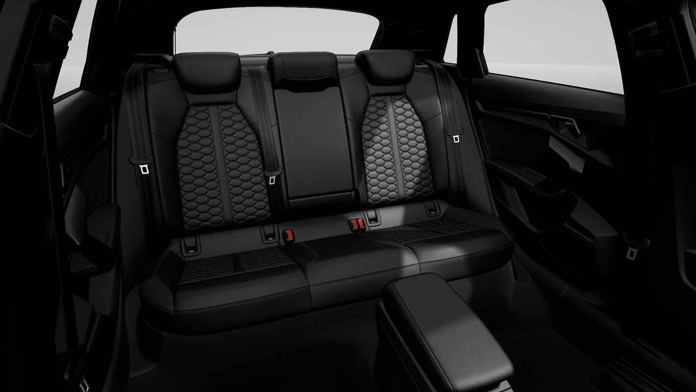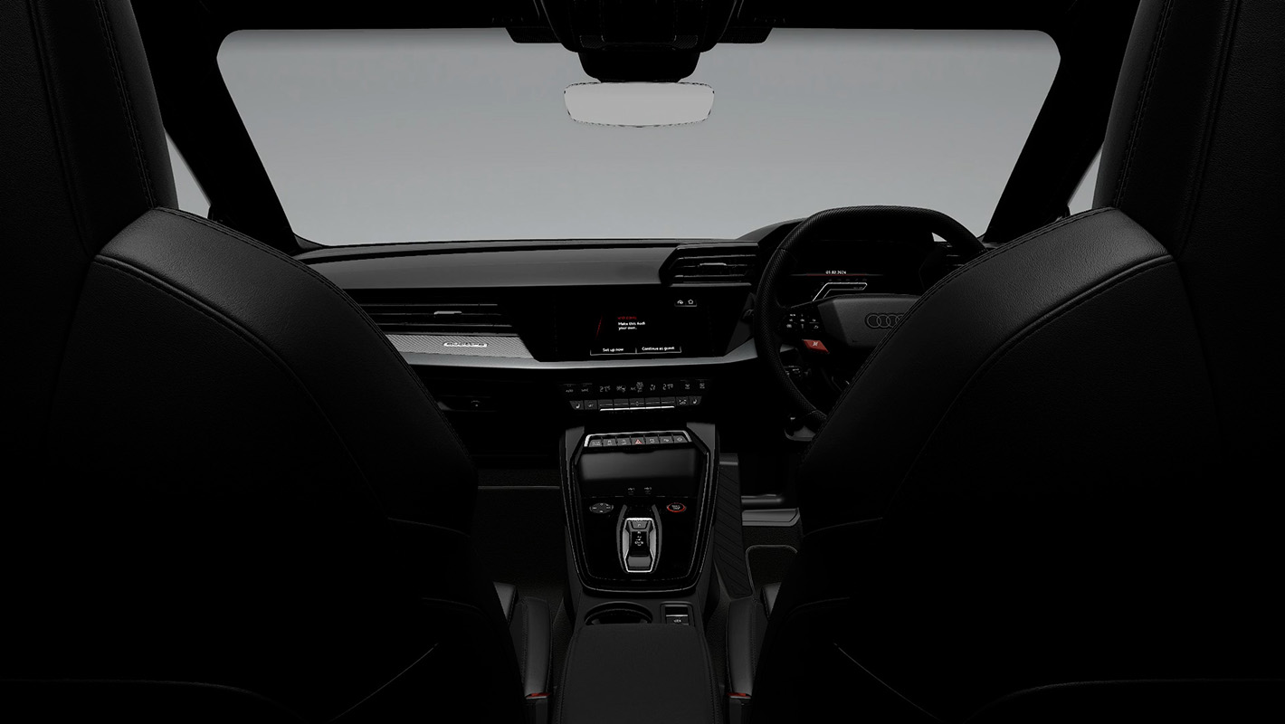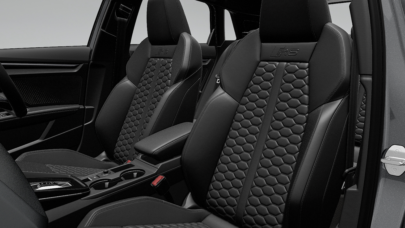 Audi RS 3の空間は、全体をダークトーンでまとめ上げバナジウムルック、カーボンアトラスのデコラティブパネル、ブラックルーフライニング、細部まで緊張感のあるスポーティな個性を際立つコントラストで磨き上げています。ファインナッパレザー仕立てのスポーツシートは、コーナリング時もドライバーの身体を確実にホールド。そして上下フラットのレーシングスタイルのステアリングホイールは手に馴染みやすく、Audi RS 3のハイパワーを意のままに操ることができます。ステアリングをはじめ、ドアシルトリム、シートなど各所にRSロゴが刻まれ唯一無二の存在であることを主張します。