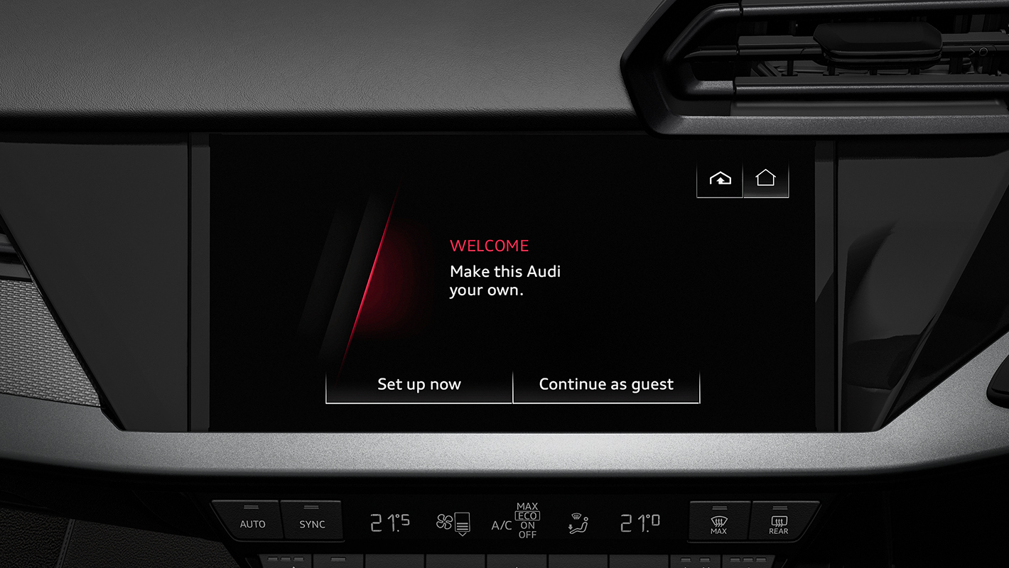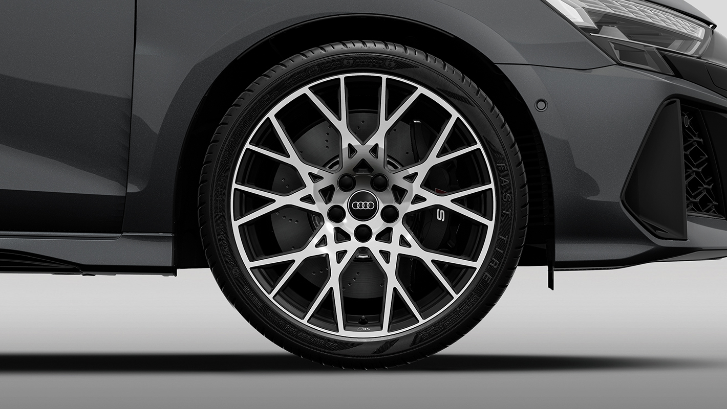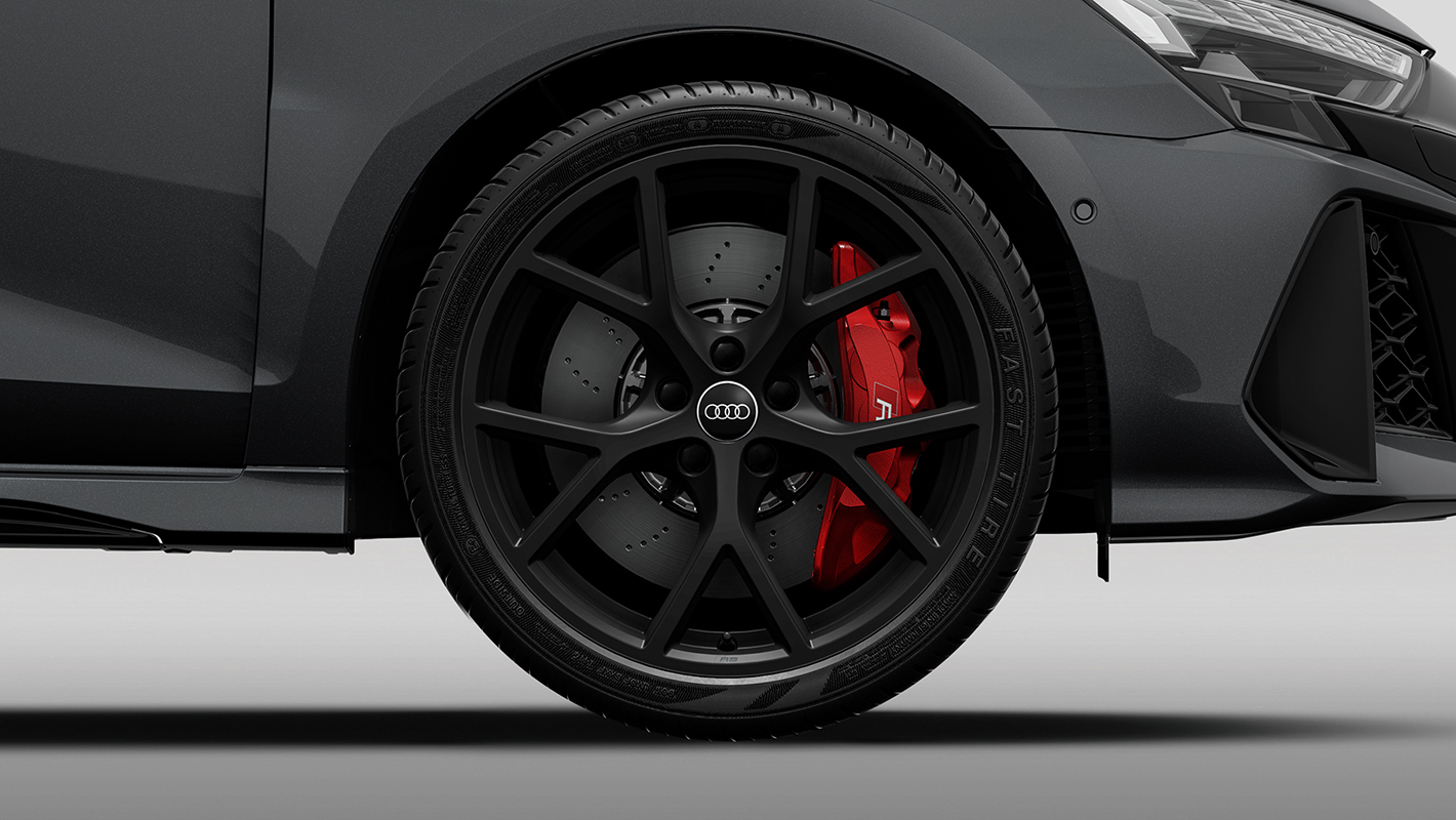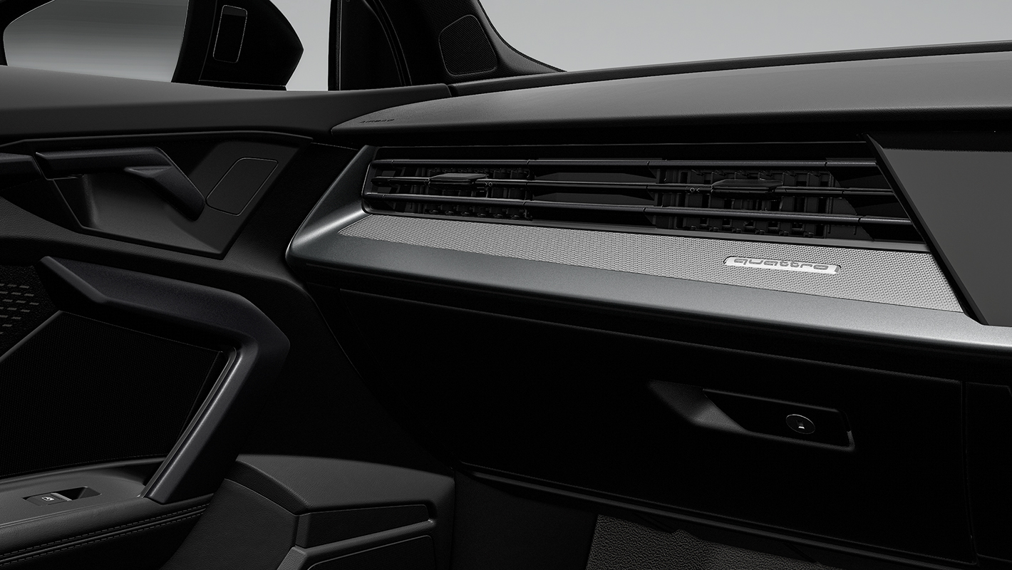 Audi RS 3の空間は、全体をダークトーンでまとめ上げバナジウムルック、カーボンアトラスのデコラティブパネル、ブラックルーフライニング、細部まで緊張感のあるスポーティな個性を際立つコントラストで磨き上げています。ファインナッパレザー仕立てのスポーツシートは、コーナリング時もドライバーの身体を確実にホールド。そして上下フラットのレーシングスタイルのステアリングホイールは手に馴染みやすく、Audi RS 3のハイパワーを意のままに操ることができます。ステアリングをはじめ、ドアシルトリム、シートなど各所にRSロゴが刻まれ唯一無二の存在であることを主張します。