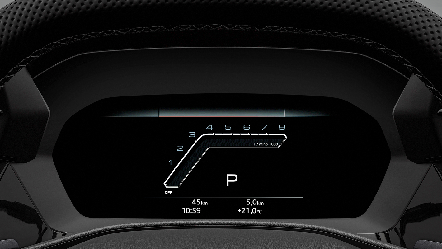 高解像度12.3インチカラー液晶フルデジタルディスプレイに、スピードメーター、タコメーター、マップ、ラジオ/メディア情報などをフレキシブルに表示。操作はマルチファンクション付きステアリングホイールからダイレクトに行えます。レイアウトは「スポーツ」、「パフォーマンス」、「ランウェイ」、「レブカウンター」から選択でき、パワー/トルク、Gメーター、ラップタイマーなどをカスタマイズして表示できます。またVIEWボタンを押すことでメーターの大小切り替えも可能。メーター表示を小さくすれば、オンボードコンピューターやMMIナビゲーションのコンテンツ、3D地形図などをより見やすく画面の広いエリアに表示できます。