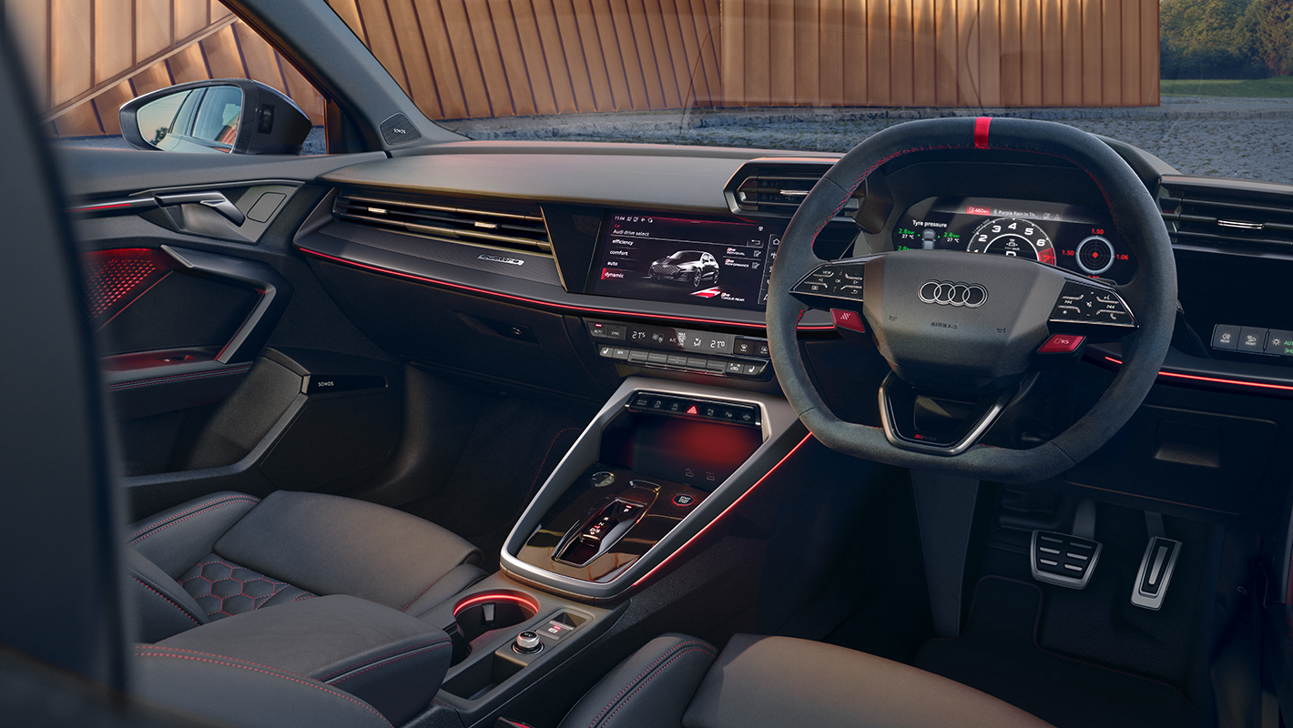 フロント、リヤに印象的な赤い縁取り付きのシートベルトが装備されます。