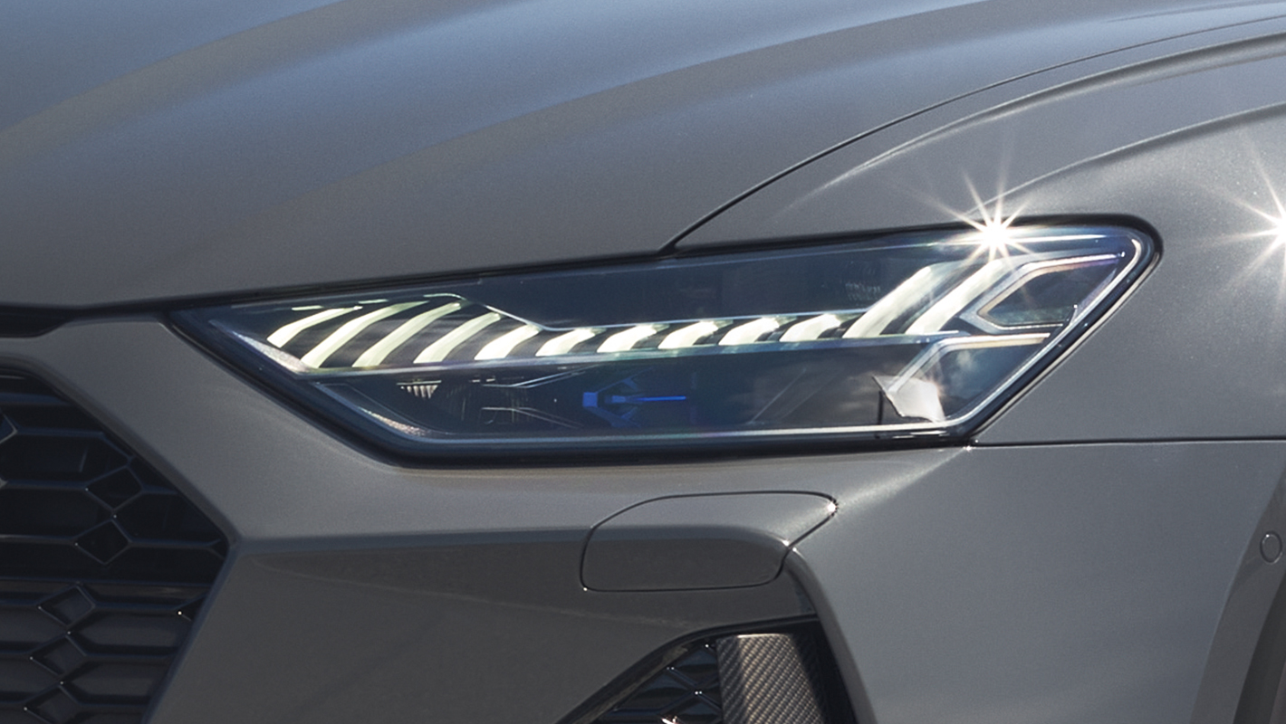 先進のライティングテクノロジーを印象的に視覚化。HDマトリクスLEDヘッドライトは、状況に合わせて配光を可変させ高度に制御。高速走行で対向車や先行車の車両を検知すると、検知された車両へ直接光を照射しないようにコントロールしつつ、それ以外の車間エリアや周辺は明るく照らし続けます。アウディレーザーライトはハイビームの照射距離を約2倍に拡大。シャープな眼差しがフロントフェイスに精悍さを与えます。