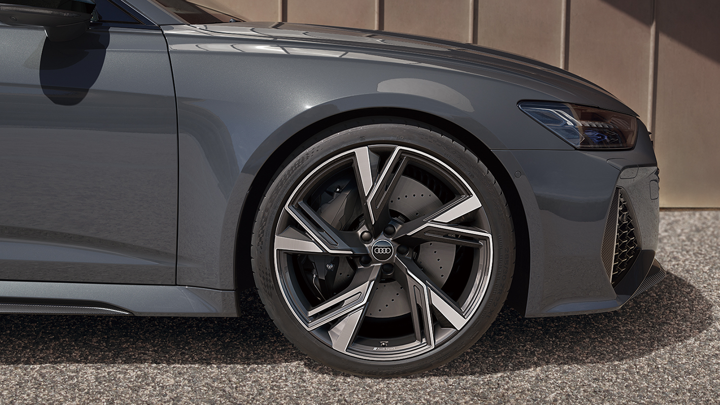 際立つデザインと大容量のラゲッジスペースを融合したAudi RS 6 Avant performance。3Dハニカム構造のシングルフレームグリル、大型エアインレットを備えたフロントバンパー、存在感あふれるリヤディフューザーインサート、精悍なルーフエッジスポイラーなどが一体となって力強い個性を表現。後方に向かって美しく流れるルーフラインとフラットなDピラーが、高い実用性を兼ね備えつつもスタイリッシュな印象を与えるAvantのシルエットを引き立てます。オプションでブラックAudi rings&カーボン/グロスブラックスタイリングパッケージ*、グロスアンスラサイトブラックの22インチアルミホイール*を選べば、筋肉質なワイド&ローのエクステリアが一層シャープに引き締められます。
