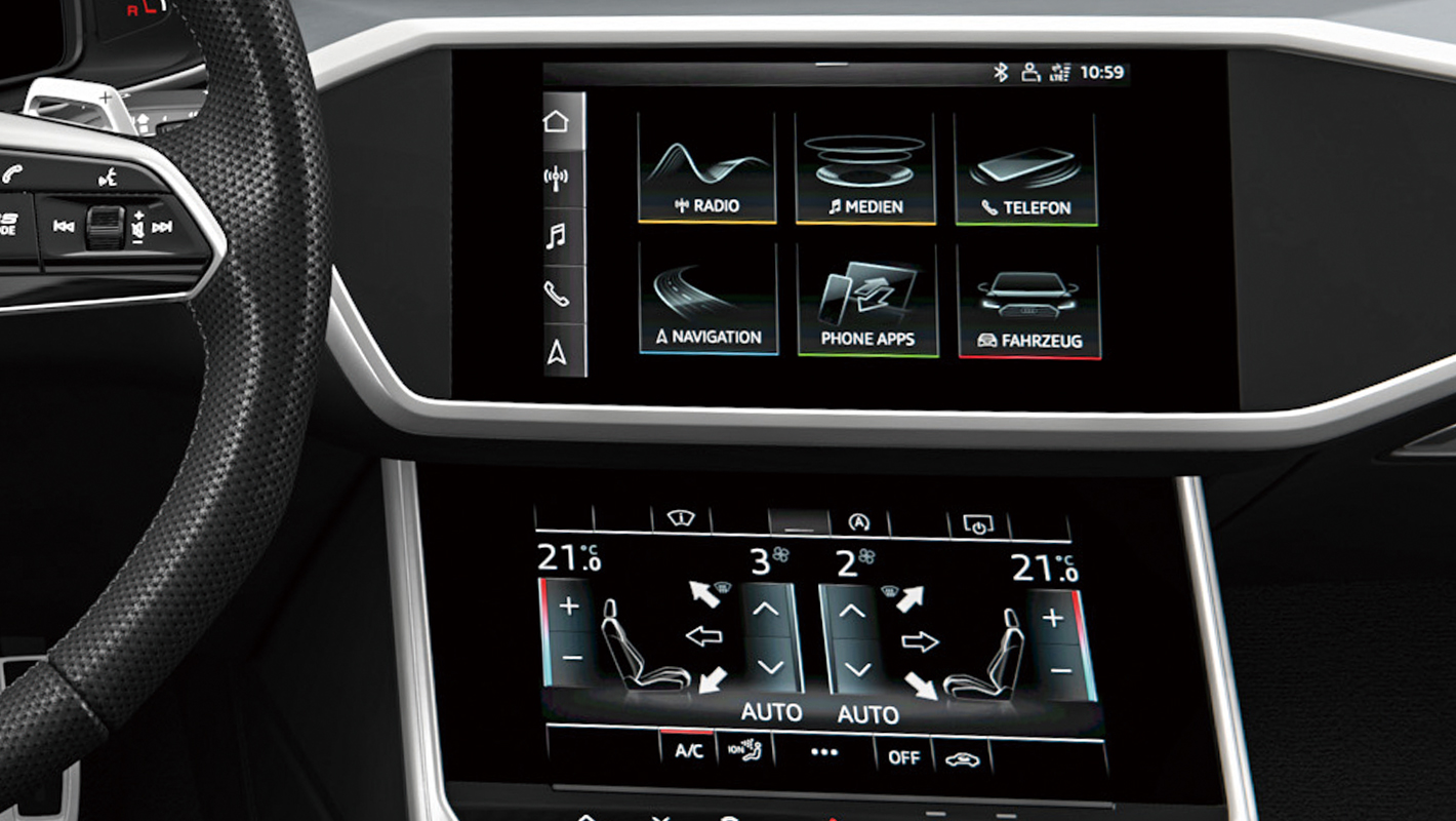 デジタル時代にふさわしいユーザーインターフェースであるMMIタッチレスポンスは、フラットな高解像度モニターで車両のセッティングやインフォテインメントを直感的に操作することが可能。グラフィックや振動、音によって、視覚、触覚、聴覚に明確な反応を感じ取れます。インフォテインメント用の10.1インチアッパースクリーンと、空調操作や手書き文字入力用の8.6インチローワースクリーンの2つのタッチディスプレイを搭載。イグニッションをOFFにするとスクリーンが漆黒のフラットなブラックパネルとなり、周囲のインテリアに溶け込みます。