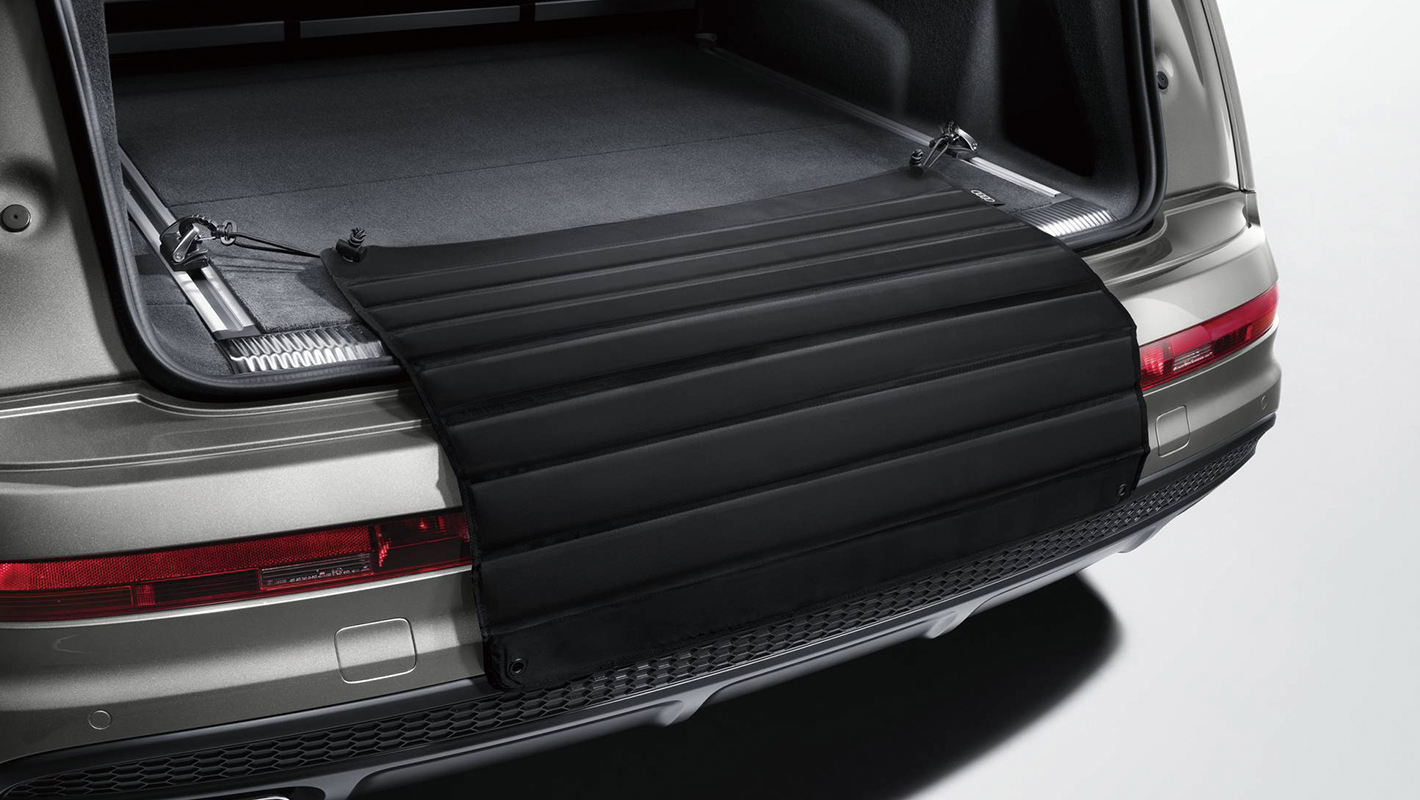 荷物の出し入れによるバンパー上部の傷を防ぐ保護マット。トランクルームフックに取り付けるタイプで、収納バッグも付属しています。大切な愛車を傷から守ります。
