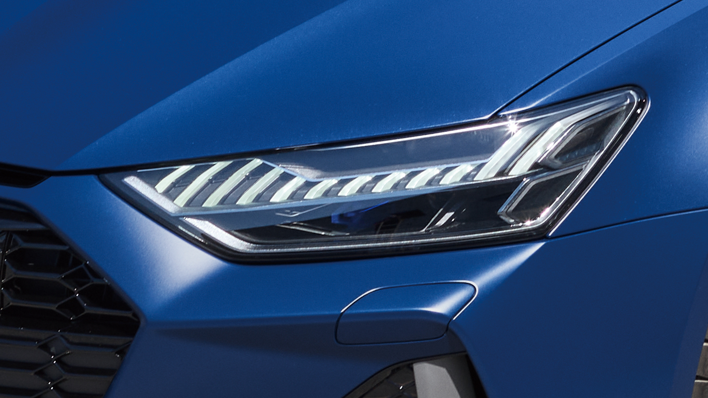 先進のライティングテクノロジーを印象的に視覚化。HDマトリクスLEDヘッドライトは、状況に合わせて配光を可変させ高度に制御。高速走行で対向車や先行車の車両を検知すると、検知された車両へ直接光を照射しないようにコントロールしつつ、それ以外の車間エリアや周辺は明るく照らし続けます。アウディレーザーライトはハイビームの照射距離を約2倍に拡大。シャープな眼差しがフロントフェイスに精悍さを与えます。