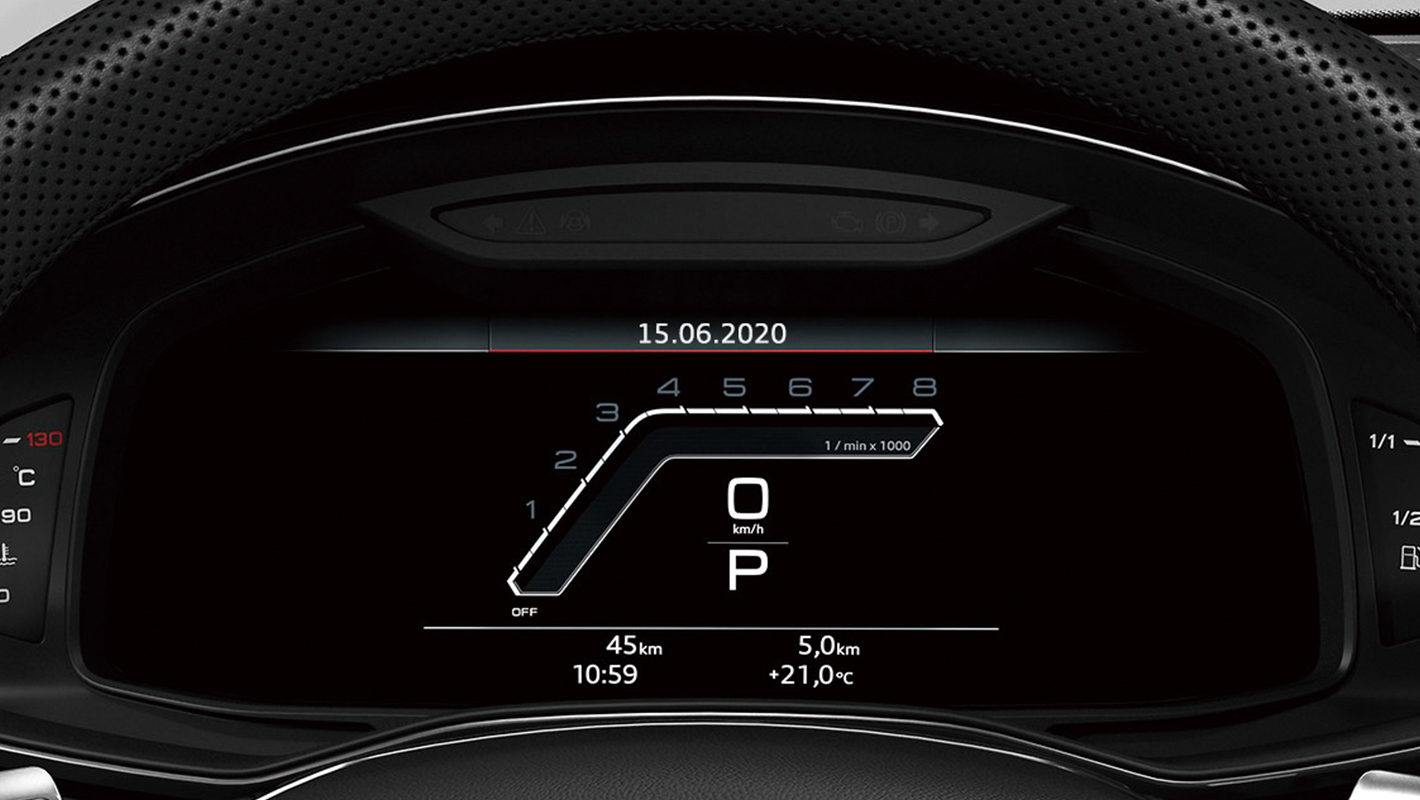 フルデジタルの高解像度12.3インチカラー液晶ディスプレイに、スピードメーター、タコメーター、地図、Audi connectサービス、ラジオ/メディア情報などをフレキシブルに表示します。VIEWボタンを押すことで、2つの円形メーターの大小切り替えが可能。メーター表示を小さくすれば、オンボードコンピューターやMMIナビゲーションのコンテンツ、3D地形図などを画面の広いエリアに見やすく表示できます。そしてRSモデル専用の表示メニューでは、中央にタコメーター/スピードメーターを配し、左右にパワー/トルク、Gメーター、ラップタイマー、タイヤ空気圧モニタリングを併せてレイアウトします。