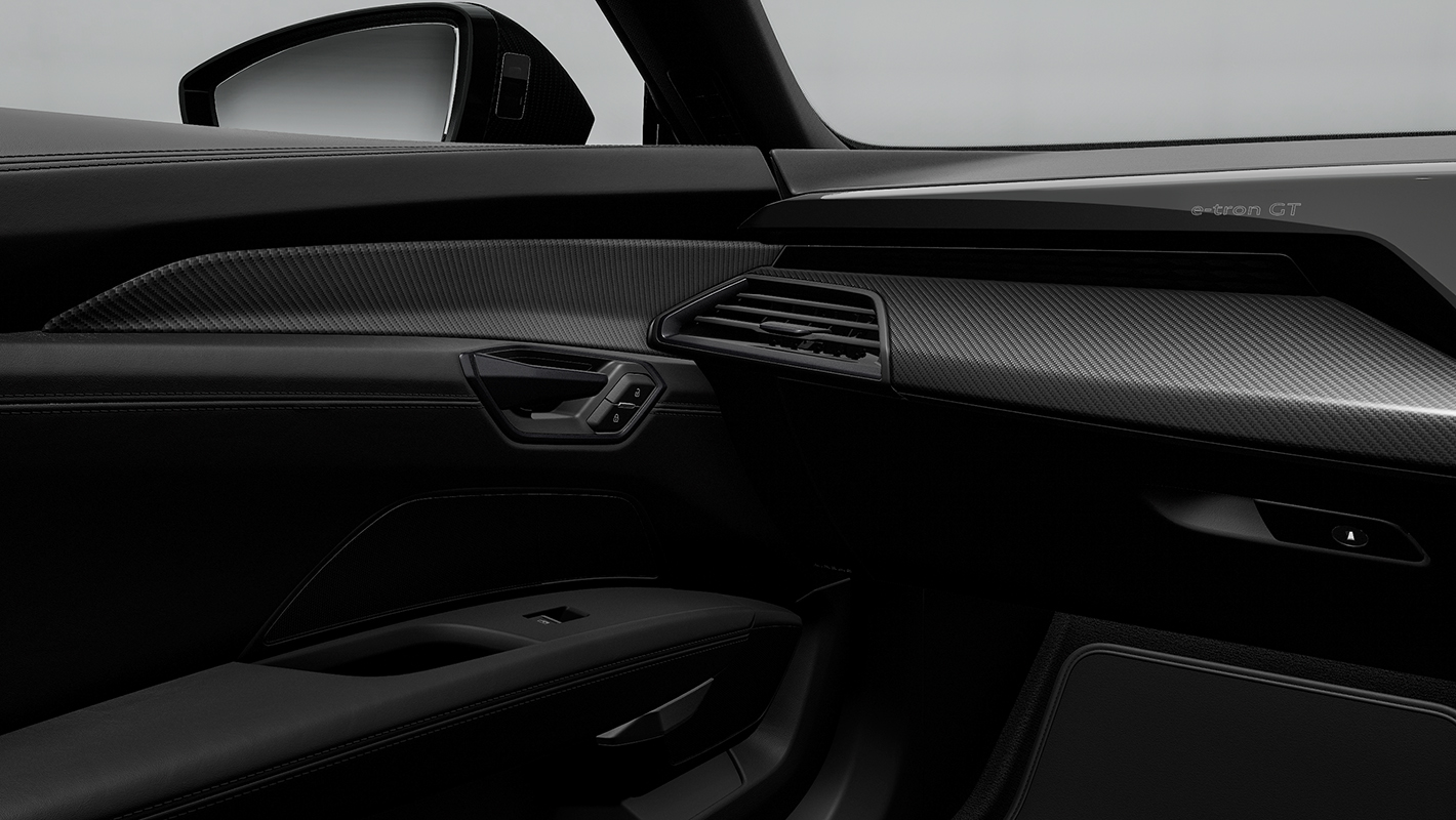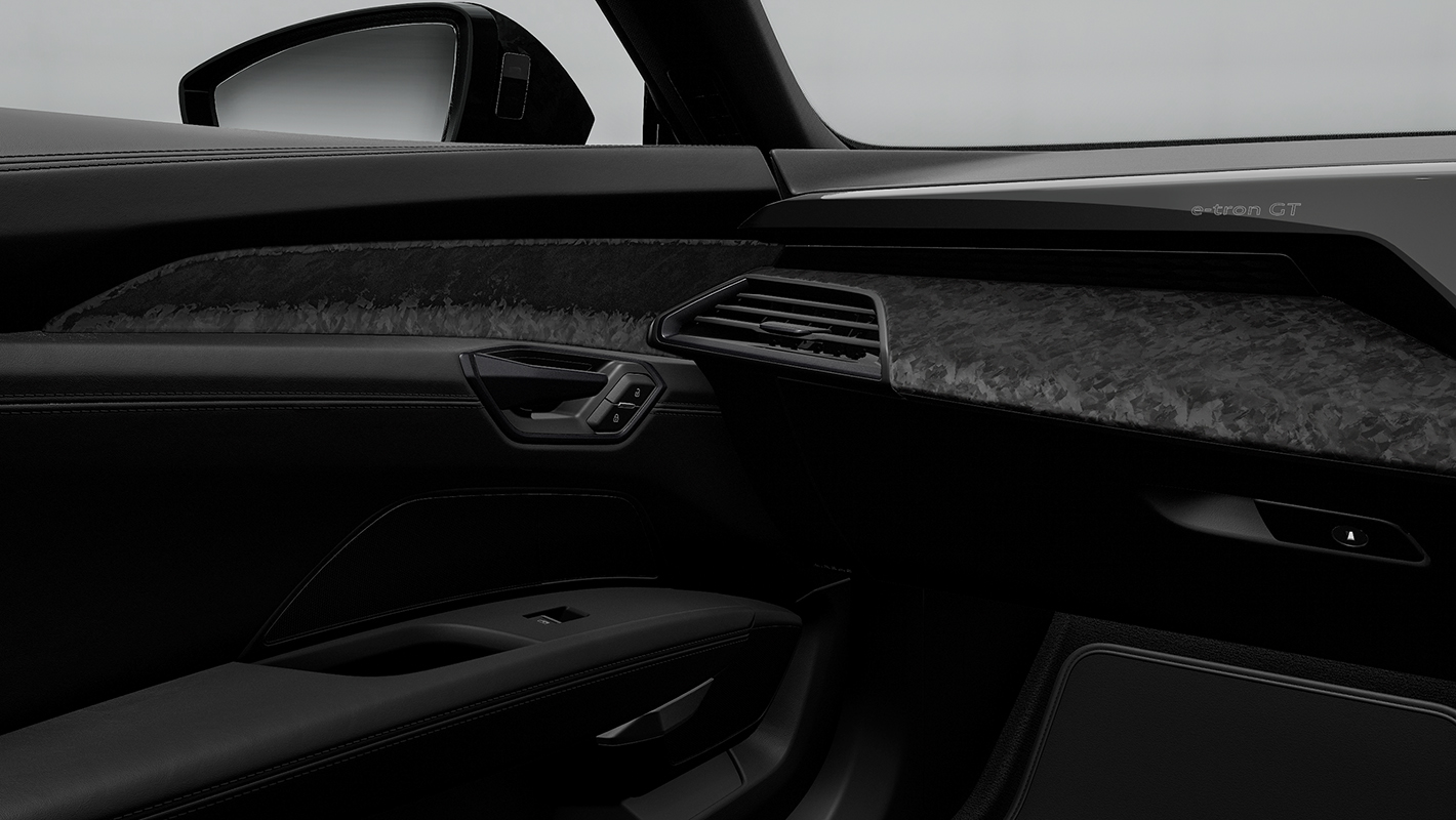 インテリアエレメンツに優れた触感を持つ洗練された素材を採用。インストルメントパネル上部、ドアレール、ドアアームレスト、センターコンソール下部がファインナッパレザー、インストルメントパネルカバー、センターコンソール上部、ドアトリムがダイナミカになります。Audi RS e-tron GT performance専用のサーペンタイングリーンの表情豊かなコントラストステッチが印象的なアクセントに。