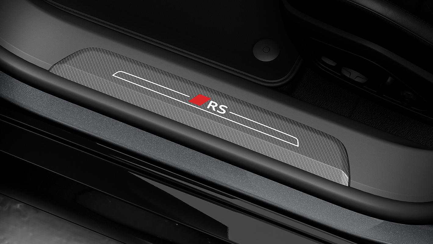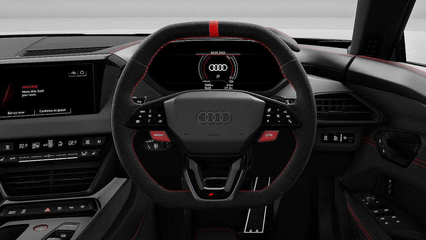 RSエンブレムがスポーティネスを主張するステアリングホイール。リサイクルポリエステルを用いて作られるスエード調人工皮革のダイナミカ仕立てで、コントラストのある印象的なレッドステッチが際立ちます。12時位置にレッドのマーカー付き。