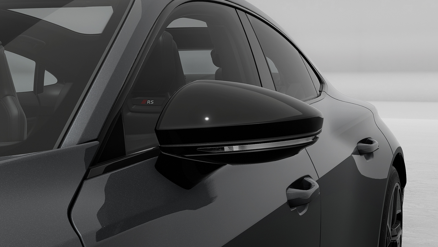 RSエンブレムがスポーティネスを主張するステアリングホイール。リサイクルポリエステルを用いて作られるスエード調人工皮革のダイナミカ仕立てで、コントラストのある印象的なサーペンタイングリーンステッチが際立ちます。12時位置にブラックのマーカー付き。