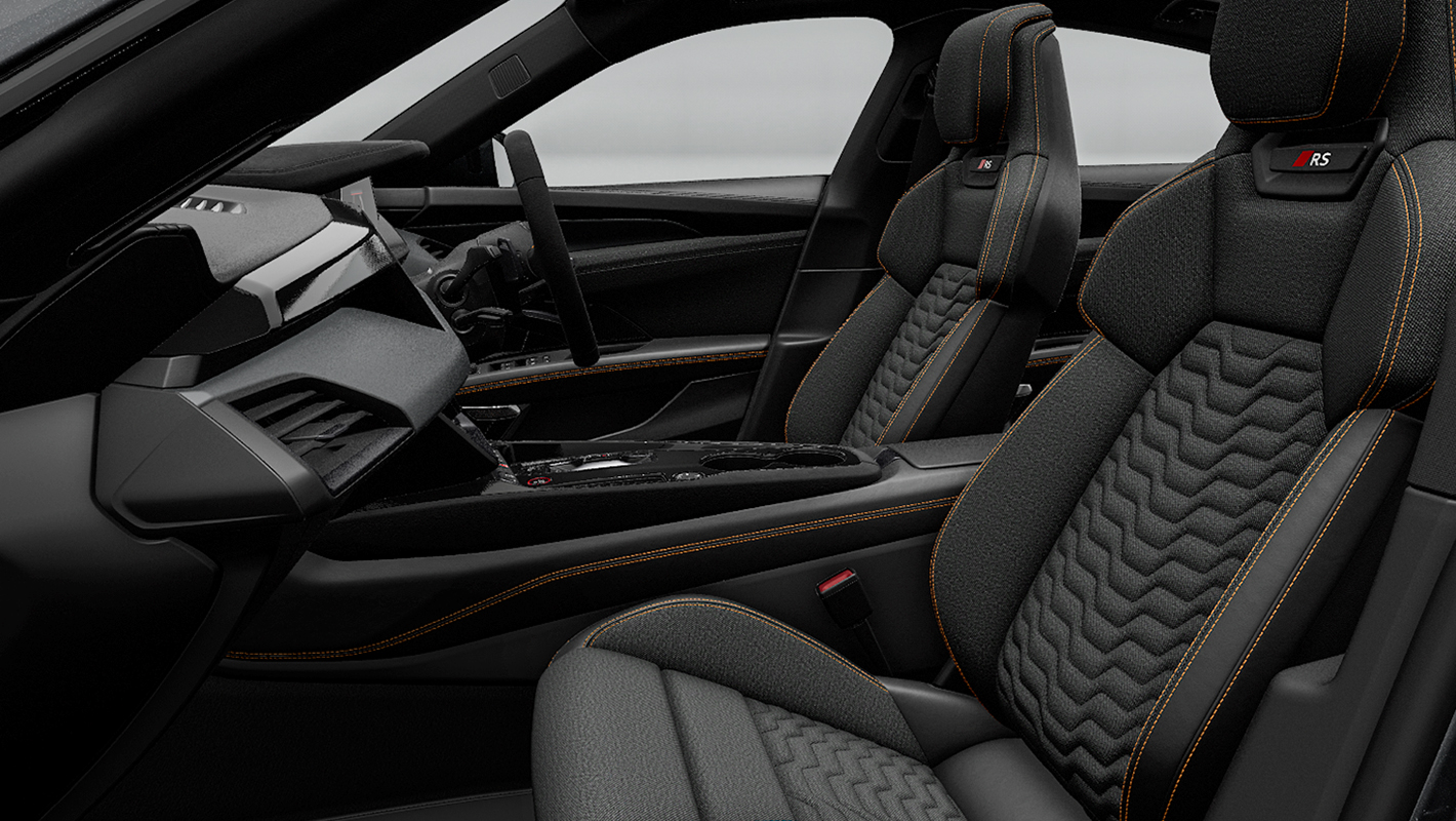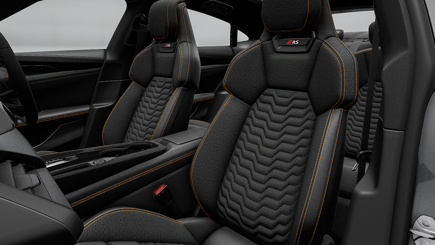 一体型ヘッドレストを備えたホールド性の高いスポーツシートにサステイナブルな素材を採用。リサイクル繊維を含むカスケ―ドクロスとアーティフィシャルレザーを組み合わせています。背もたれに立体的に表現されたウォーターフォールパターン、ダイナミックオレンジのステッチがアクセントとなり、素材の革新性を印象づけます。