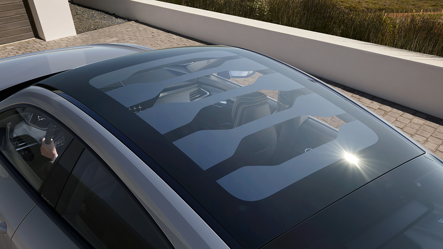 天井全体に広がるスマートパノラマガラスルーフは、透明度を変更できるPDLC技術 (ポリマー分散型液晶)を採用。9セグメントに分けて遮光モードの切り替えができます。熱線を低減する構造により、快適性を保ちながら車内の隅々に自然光を豊かに採り込めます。システムを停止すると自動で不透明に切り替わり、再びシステムを始動すると最後に選択した設定になります。