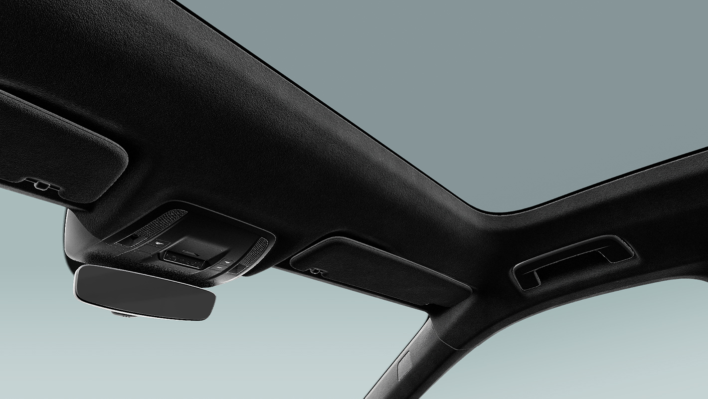 リサイクルポリエステルを用いて作られるスエード調人工皮革のダイナミカを使ったブラックのヘッドライニング。