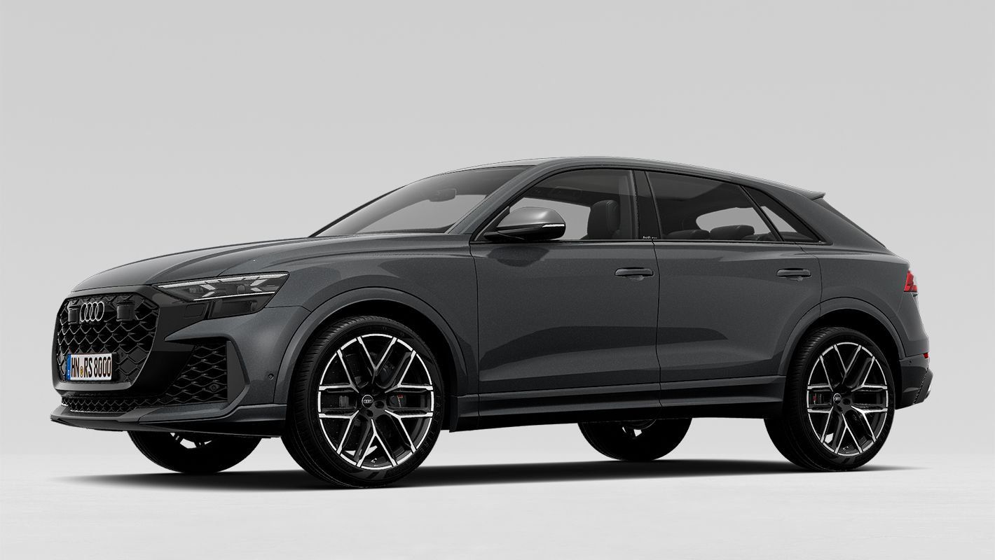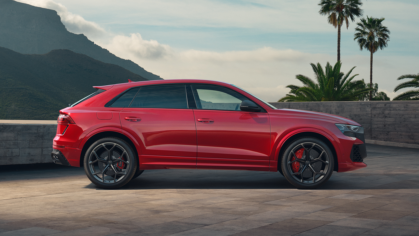 類稀なる運動性能を主張する、堂々と逞しいAudi RS Q8 performance。そのスタイリングはSUVらしい力強さと格式高いエレガンスが美しく融合します。際立つエアインテークとブレードを備えたバンパー、RSならではのハニカムデザインが施されたフロントグリル。引き締まったボディラインにquattro®を象徴するように張り出したブリスターフェンダーが大径23インチアルミホイールと共に力強さを主張。優美なルーフラインは、後方へとなだらかな線を描きルーフスポイラーがスポーティネスを際立たせます。精悍さを備えたリヤビューは専用エレメントにより後ろ姿でもアグレッシブさを演出します。