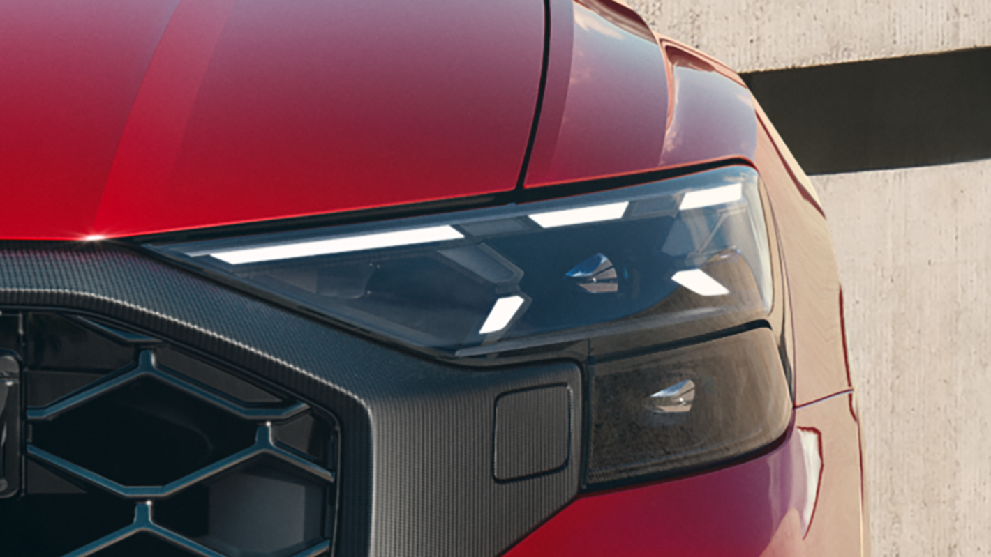 洗練された表情で個性を強烈に印象づけるのは、RS特有のハニカムデザインの八角形シングルフレームグリル。各ハニカムセルが3次元的にデザインされた、より堂々としたフロントビューに。さらにダイナミックな形状の大型エアインテーク、ダークベゼルでシャープに研ぎ澄まされたHDマトリクスLEDヘッドライトと相まって、強い存在感を示します。